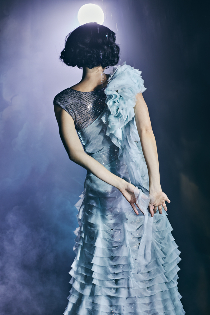 Bai Lu wears a one-shoulder dress with asymmetrical buttoning. The dress is constructed with strips – one kilometer of strips in total – of celadon and mint silk chiffon mounted on a base of illusion tulle to give a stormy, ruched effect.
