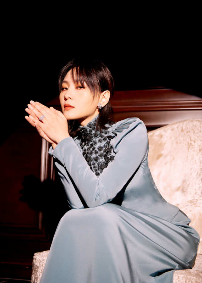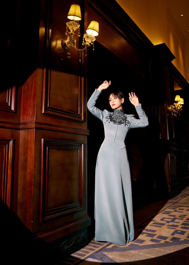 Chinese singer wore an outfit from the Haute Couture Collection First Spell. This is a trompe l’oeil dress with a vest effect from the late nineteenth century. This dress is embroidered with jet motifs on a sage colored silk sheet.