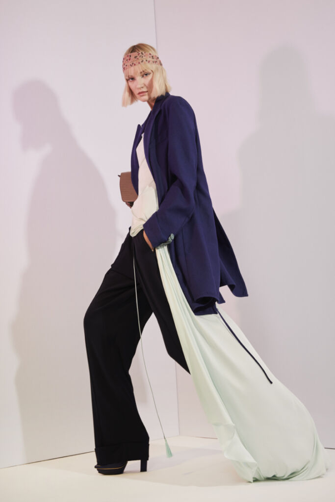 The ensemble comprises dinner jacket trousers, a signature of Julien Fournié Haute Couture, an asymmetric tank dress and a slit frock coat. The frock coat is in night-coloured silk bourrette. The trousers are in night-coloured silk double jersey. The dress is in mint silk jersey. For the fashion show, the ensemble was matched with the Baguette Mercure Sand bag.