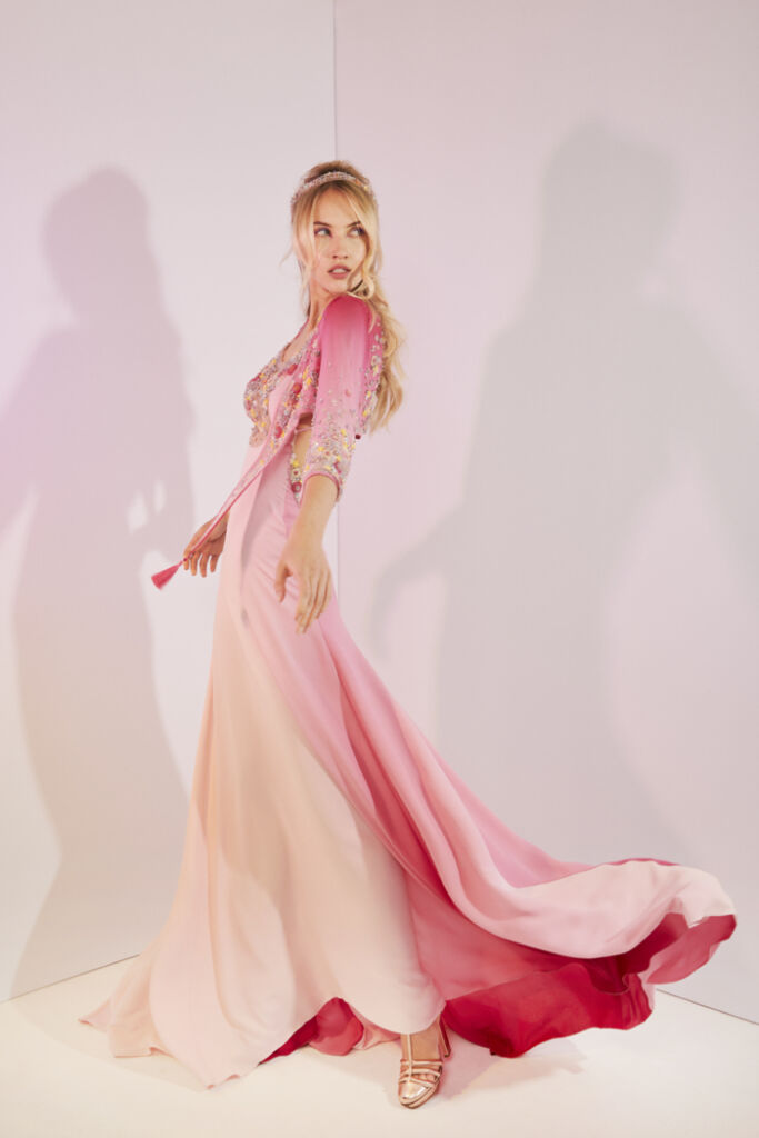 Julien went then back to sketching… With all the “petites mains” in his Haute Couture atelier, he cut, he draped, he imagined new embellishments for his haute couture collection. Twenty-five silhouettes emerged to compose “First Sunshine”, a resolutely summery and festive Haute Couture collection, with new cuts in Julien’s repertoire, a tribute to women freed from constraints, and designed to magnify their nature and simply celebrate the joy of partying in the open air in summertime.