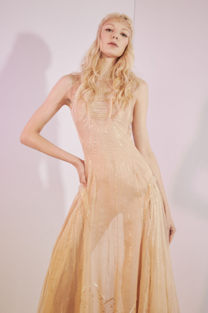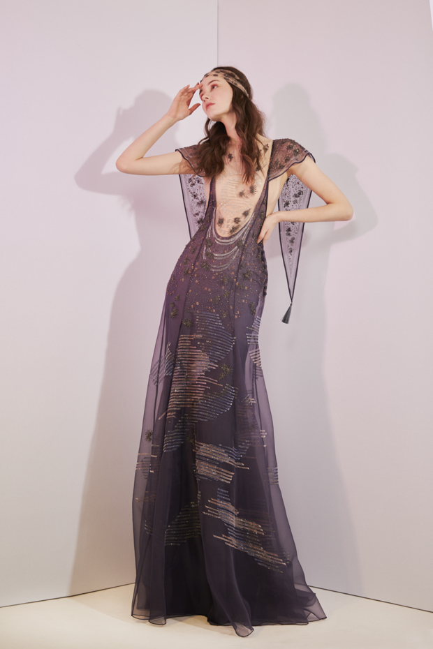 The collection meets the need for freshness with its light and delicate fabrics and a palette of precisely chosen colors. Transparencies, cuts and inlays let bodies breathe, uncover skin and illuminate each lady’s personality. In the final bouquet, three fresco dresses play with embroidered transparencies and summon the sun at dawn, at zenith, at dusk.