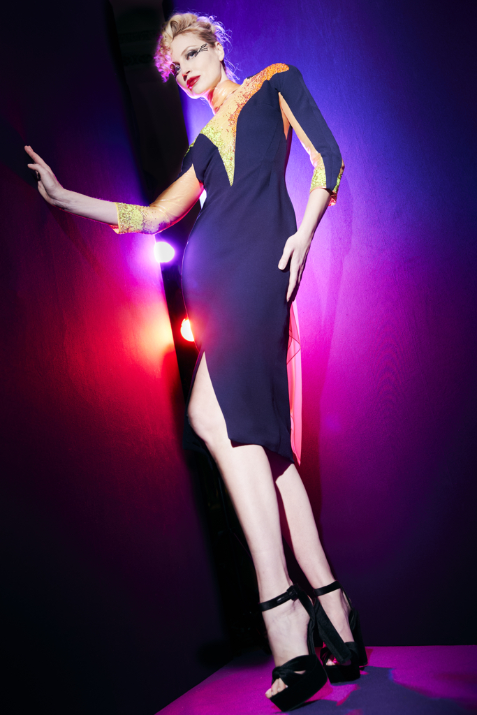 Embroidery becomes a major asset here. Julien Fournié imposes it for all ages and conditions. Far from reserving his style to young girls only, Julien Fournié dares to imagine for Michaela Tomanova – his seven months pregnant muse – a jersey evening sheath built on a fully embroidered harness over the shoulders.