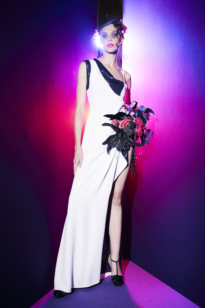 Luxurious fabrics and impeccable finishings add to the sophistication. The first look sets the tone with a Parisian elegance note, made of freedom and originality; in a unique black feather tweed – the result of a collaboration with feather artist Julien Vermeulen – Julien Fournié profiles a mid-calf sheath, a sumptuous and delicate shell for the body.