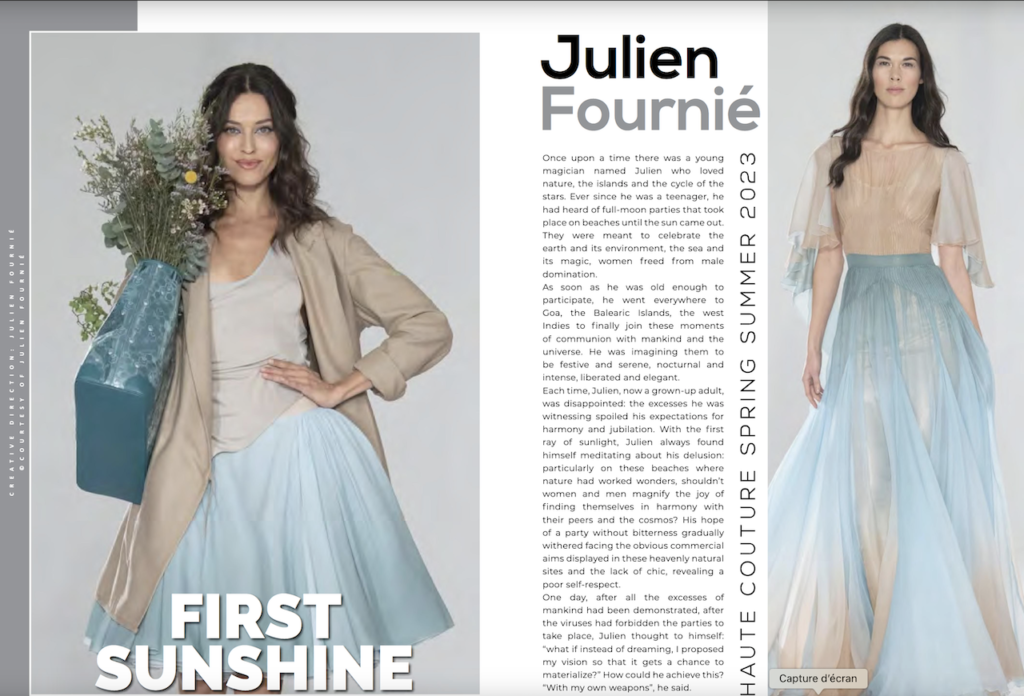 … Julien went then back to sketching… With all the “petites mains” in his Haute Couture atelier, he cut, he draped, he imagined new embellishments. Twenty-five silhouettes emerged to compose “First Sunshine”, a resolutely summery and festive collection, with new cuts in Julien’s repertoire, a tribute to women freed from constraints, and designed to magnify their nature and simply celebrate the joy of partying in the open air in summertime…