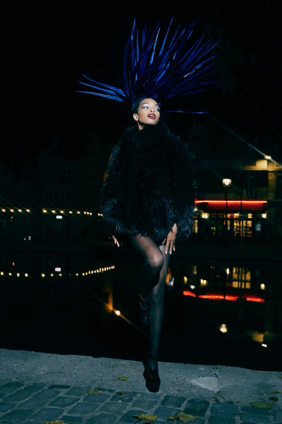 Chloé Etienne is wearing a hairy ball Haute Couture coat created by Julien Fournié and a feather headdress from Julien Vermeulen.
