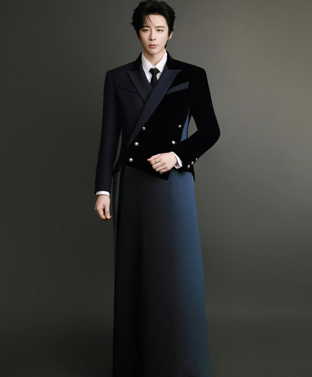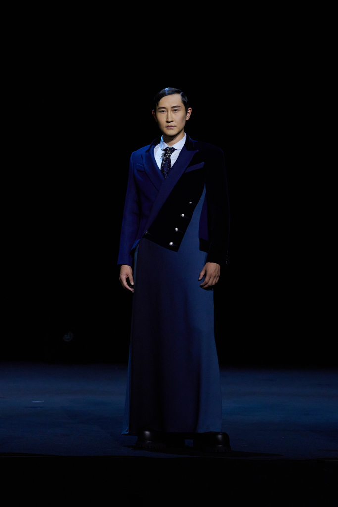 Liu Yuning wore a double-breasted, unstructured, asymmetrical, fluid and slit dinner jacket frock coat in midnight blue powdered wool, midnight blue silk velvet and double silk georgette crepe in midnight and duck shades. The vintage buttons are solid silver. This outfit was shown during the First Circus Haute Couture collection.