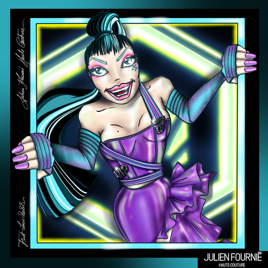 Julien Fournié draws inspiration from his many passions: cinema, comic books, superheroes, art history, and historical costumes. These influences populate his sketches with futuristic goddesses in metallic trench coats, princesses from reimagined fairy tales, and androgynous figures with the charisma of manga characters. This diversity of worlds fuels the originality of his graphic style.