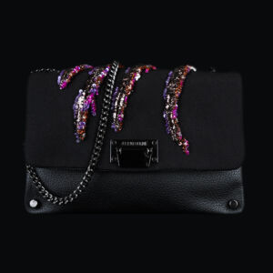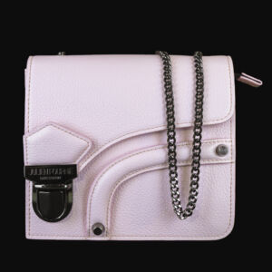 – Versatile carry: subtly gleaming silver chain, detachable for hand carry via an innovative front strap.