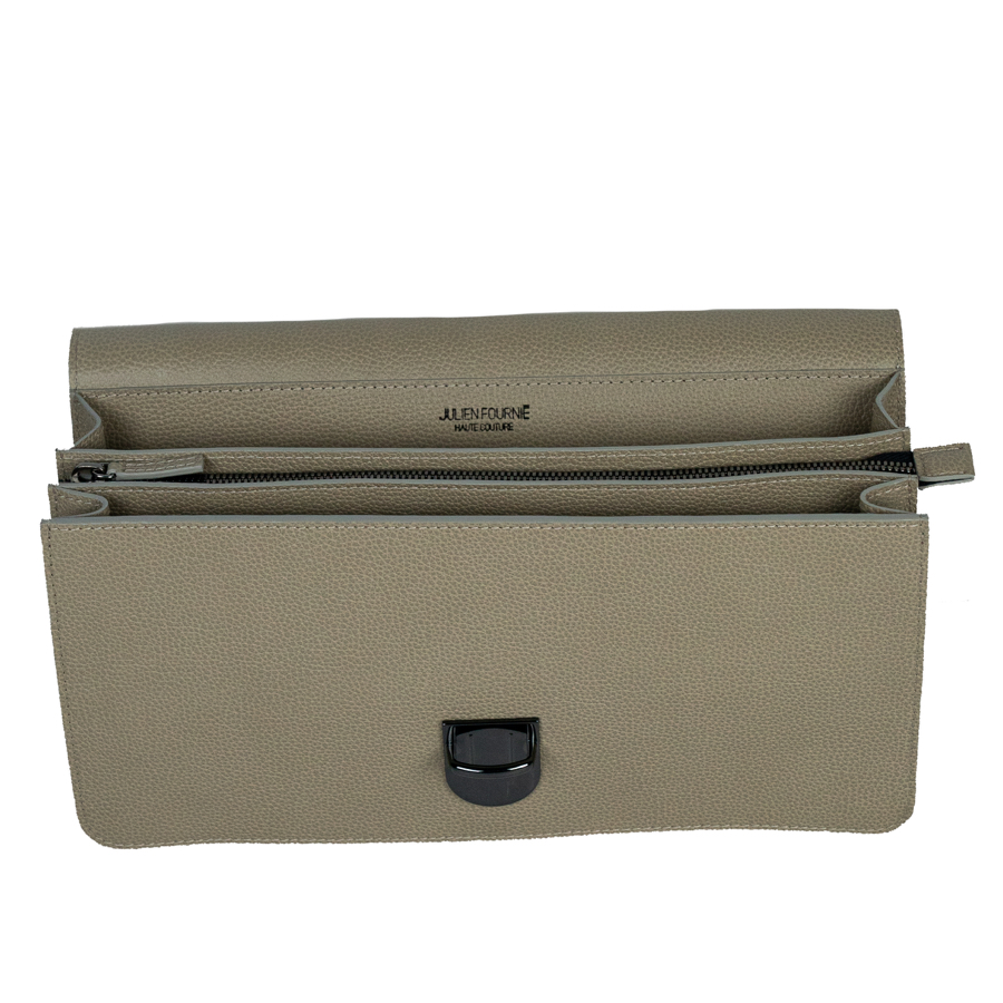 A tuck clasp gun color and signed gives it its character to the Mercury Bag.