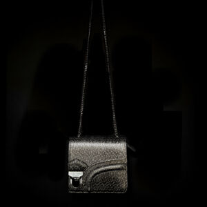 – Versatile carry: subtly gleaming silver chain, detachable for hand carry via an innovative front strap.