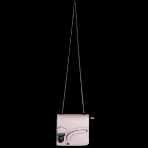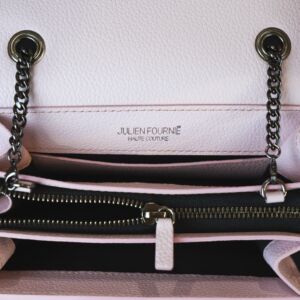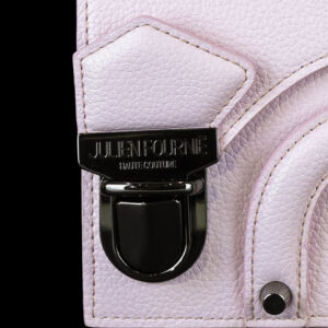 Crafted from grain-textured calfskin in a candy-pink hue, this model stands out with its geometric lines and pronounced curves. A subtly gleaming silver chain detaches to reveal an innovative front strap, allowing you to wear it over the shoulder or carry it by hand. Its metal tuck clasp, exquisitely engraved with the Julien Fournié Haute Couture logo, cements its place in the most exclusive couture realm.