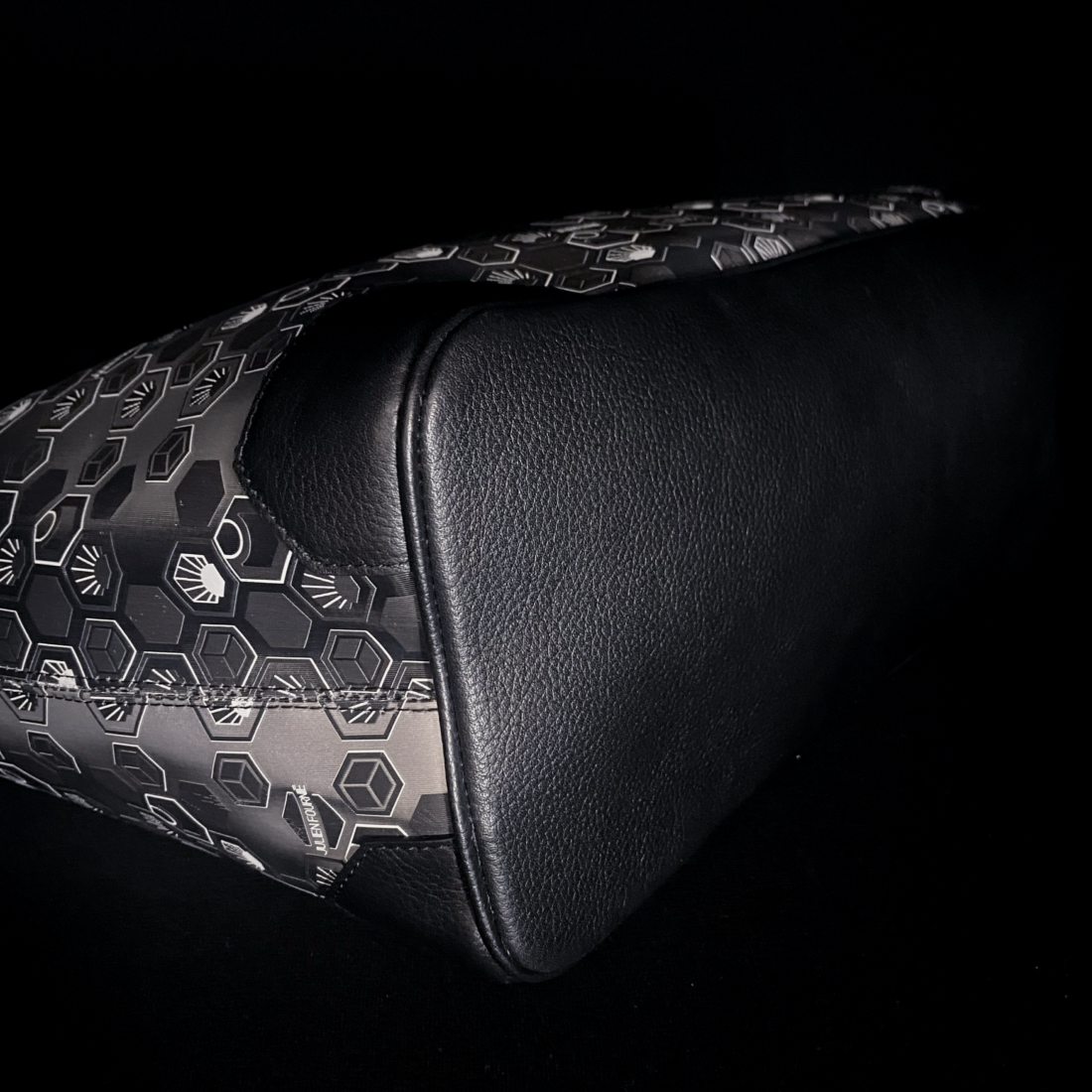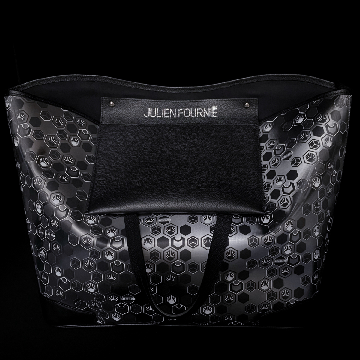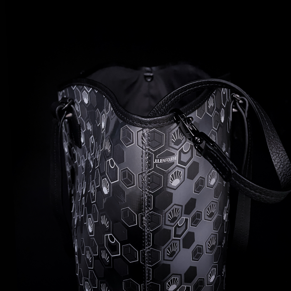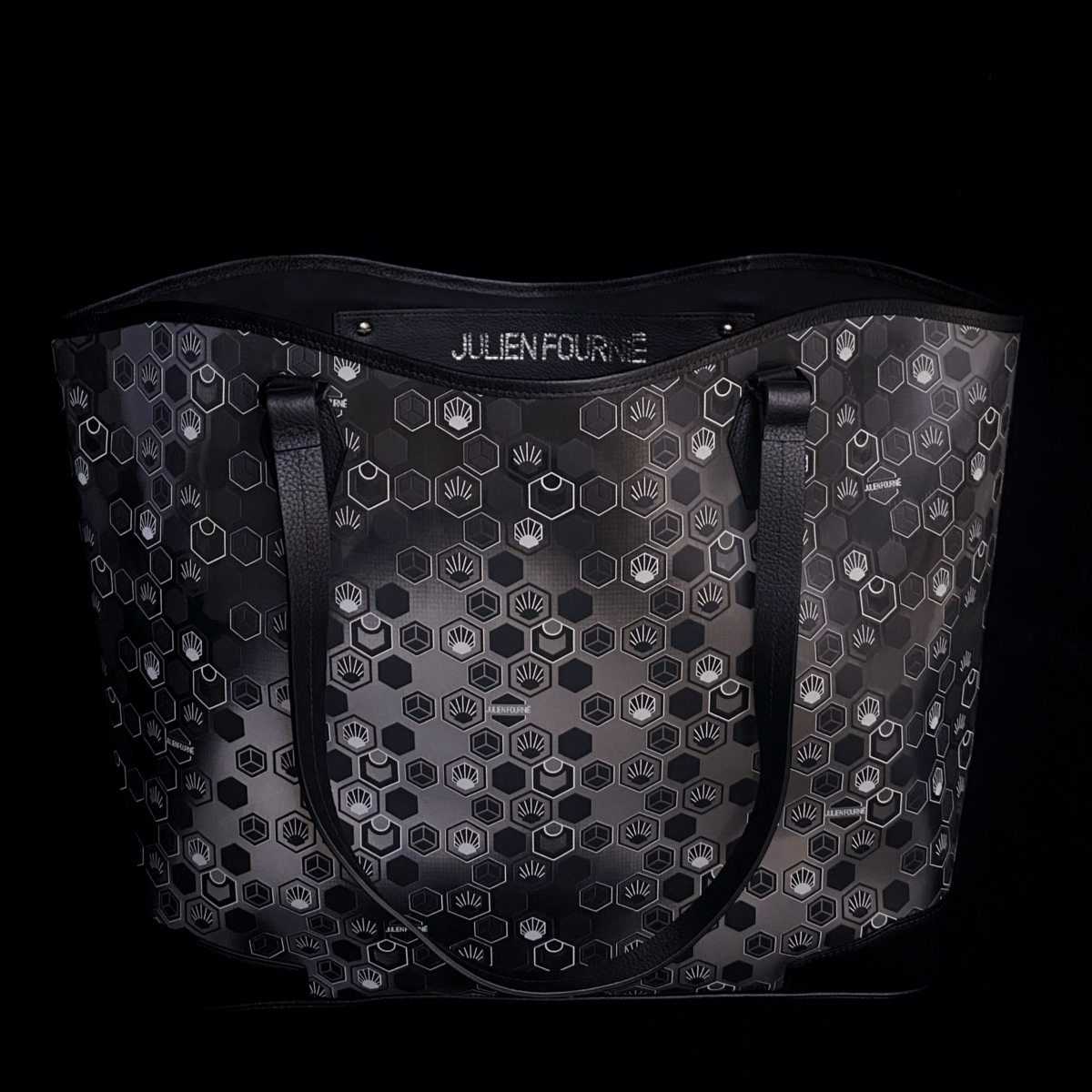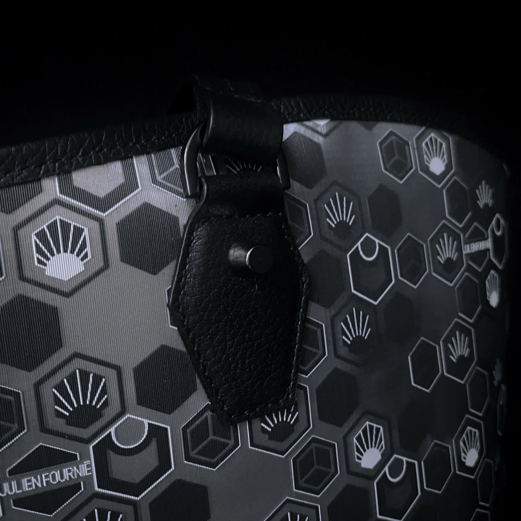 The canvas is hand-silkscreened with Julien Fournié’s iconic Hexagon monogram—a subtle tribute to infinity and cosmic architecture.