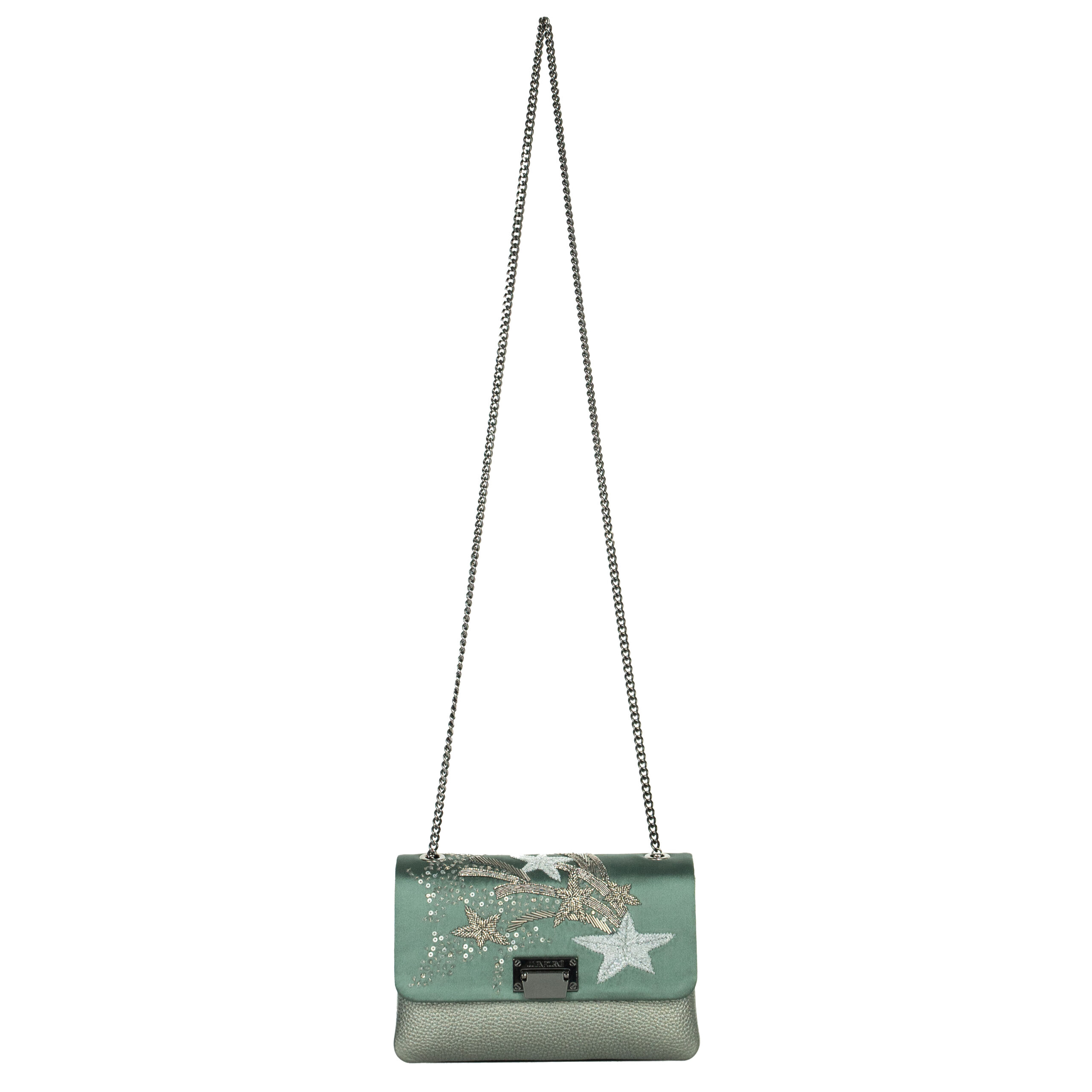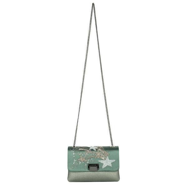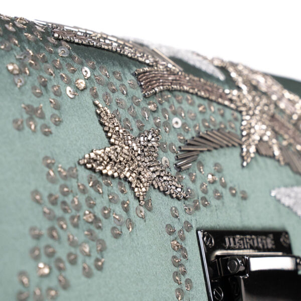 Premier Constellations handbag in metallic grained leather with pewter-colored silk satin flap embroidered with pearl constellations, cannon-gun sequins and crystal.