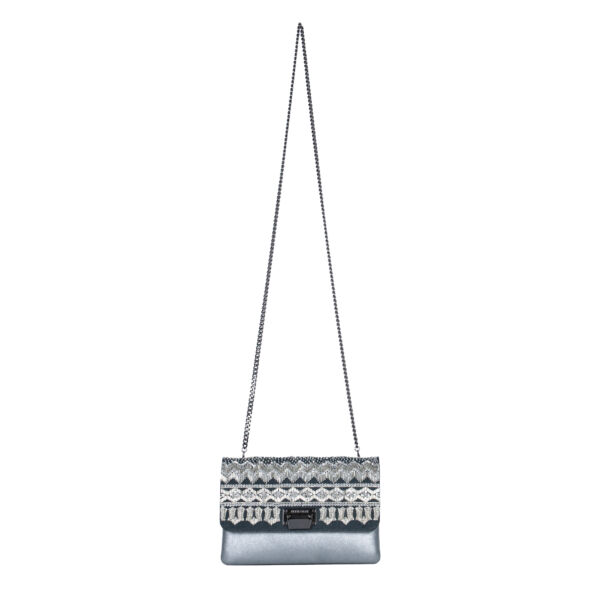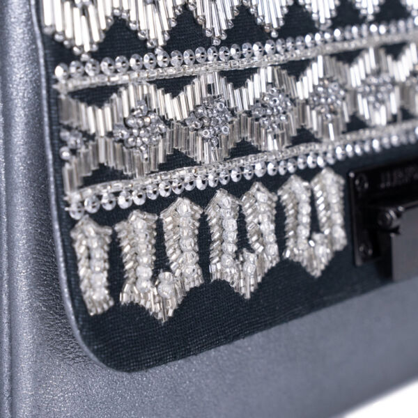 The flap, cut from anthracite gazar, contrasts beautifully thanks to intricate embroidery of micro-beads, delicate tubes, and finely faceted crystal shards arranged in a Shetland-inspired motif that evokes wild, windswept landscapes.