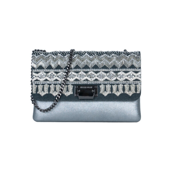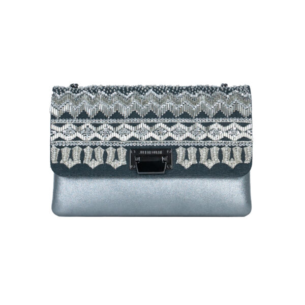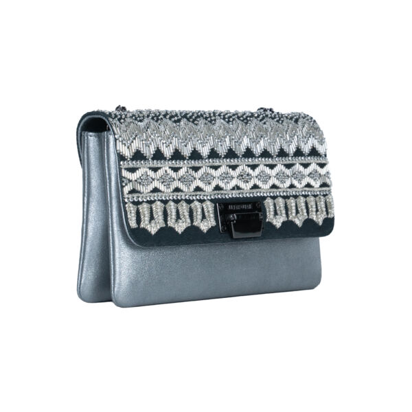 Each bead, tube, and crystal fragment is hand-placed in a marriage of strength and grace—where the resilience of metallic leather meets the fragile poetry of couture ornamentation. This balance of cool textures and sparkling accents gives the bag a look that’s both decidedly modern and deeply rooted in artisan tradition, a true couture talisman that elevates any silhouette.