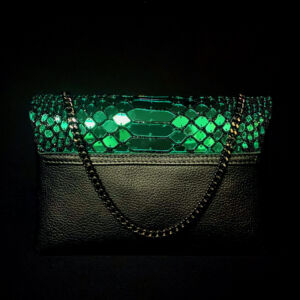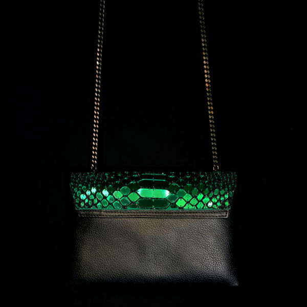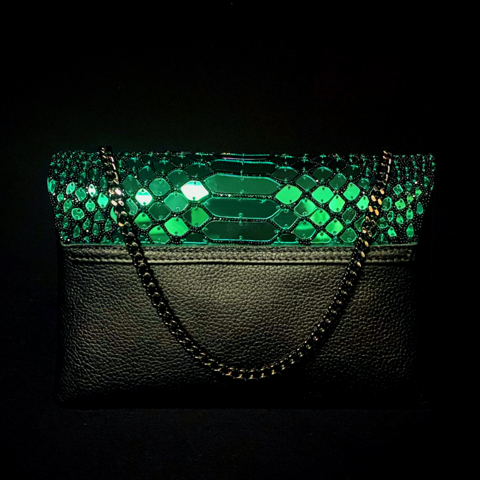 A true jewel-like handbag crafted from black grained leather, featuring emerald satin leather embroidered with mirror-faceted plexiglass emeralds and micro-faceted crystal beads.