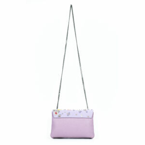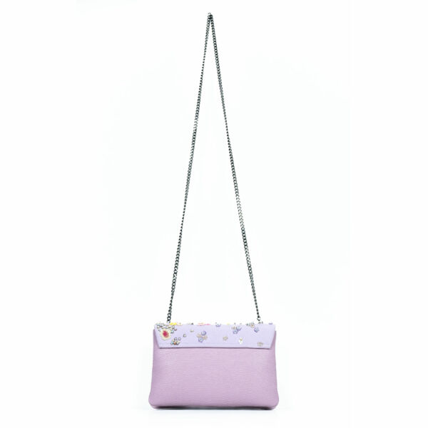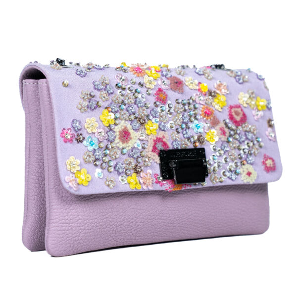 This luxury bag in lilac silk satin, is embroidered with 3D sequined flowers, crystals and silk tulle, lavender-coloured dipped lambskin leather. The side gussets are in lavender-coloured dipped lambskin leather. The removable and adjustable chain (Length 121cm) and metalwork are “gun metal” color. The interior of this shoulder bag is in grosgrain faille, with a double gusseted interior pocket and an interior zipped pocket.