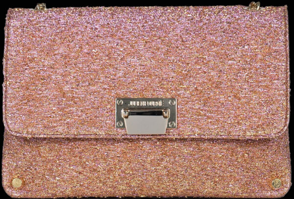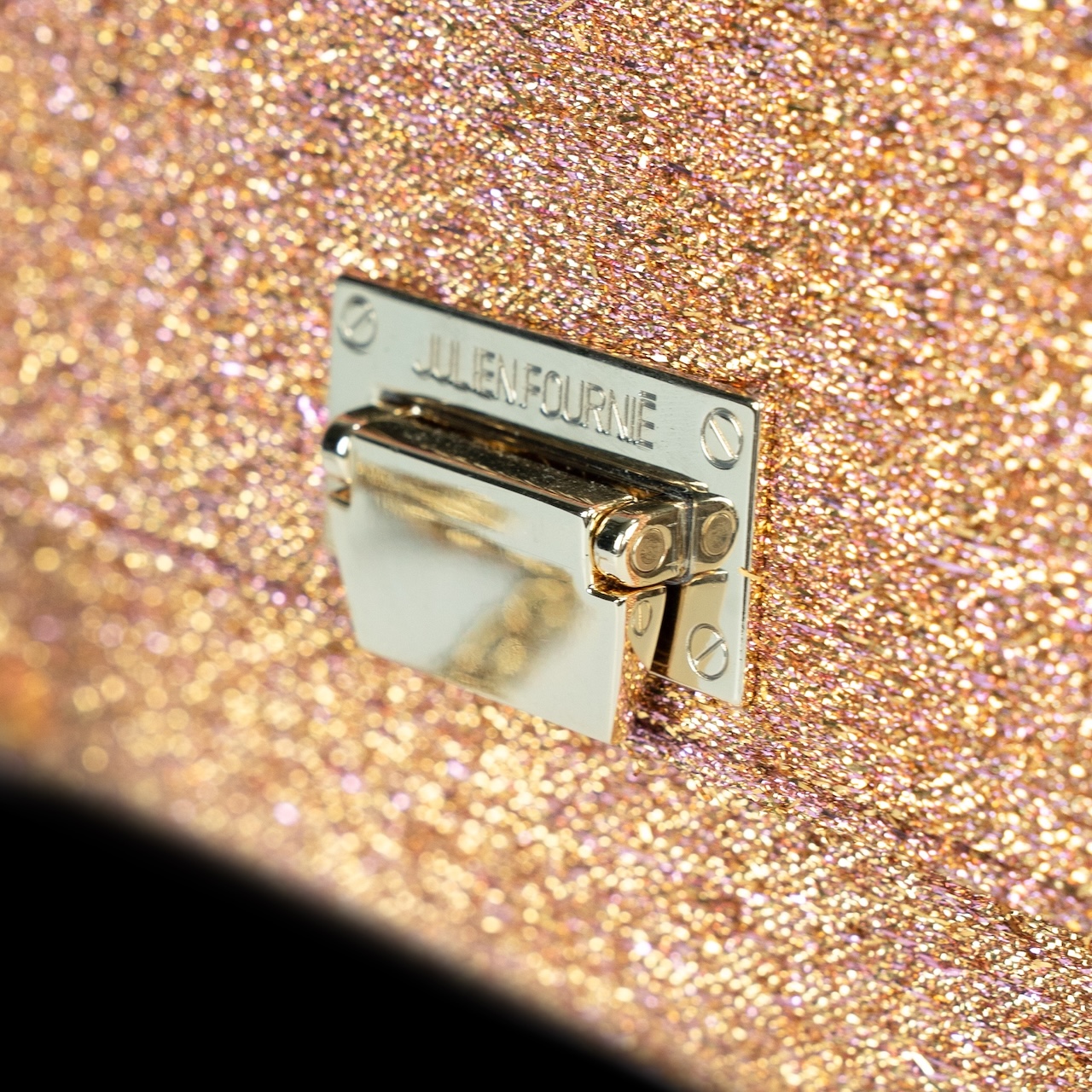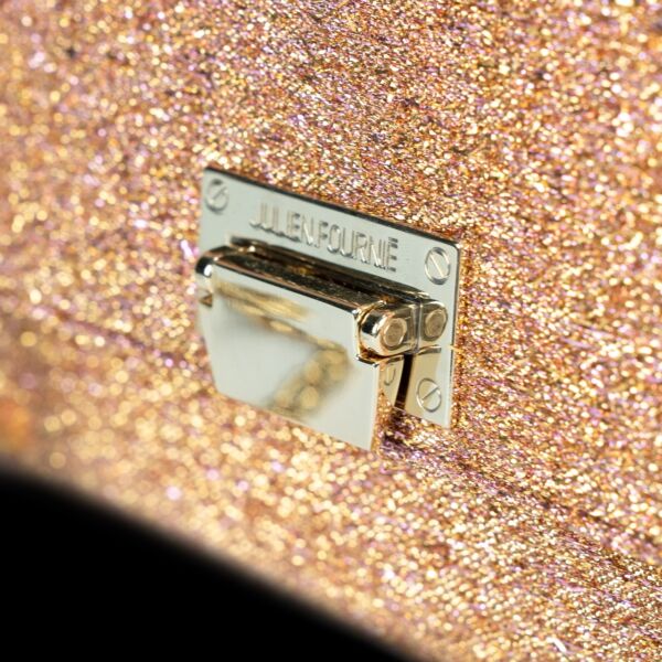 Step into a dazzling dimension with the Premier Bag Laser Game Goldie Pink, where light becomes texture. This luxury bag is crafted from an opulent gold-pink lurex jacquard woven on a silk-thread base, a textile developed exclusively for the House of Julien Fournié. Radiant and hypnotic, it captures light with vibrant intensity.