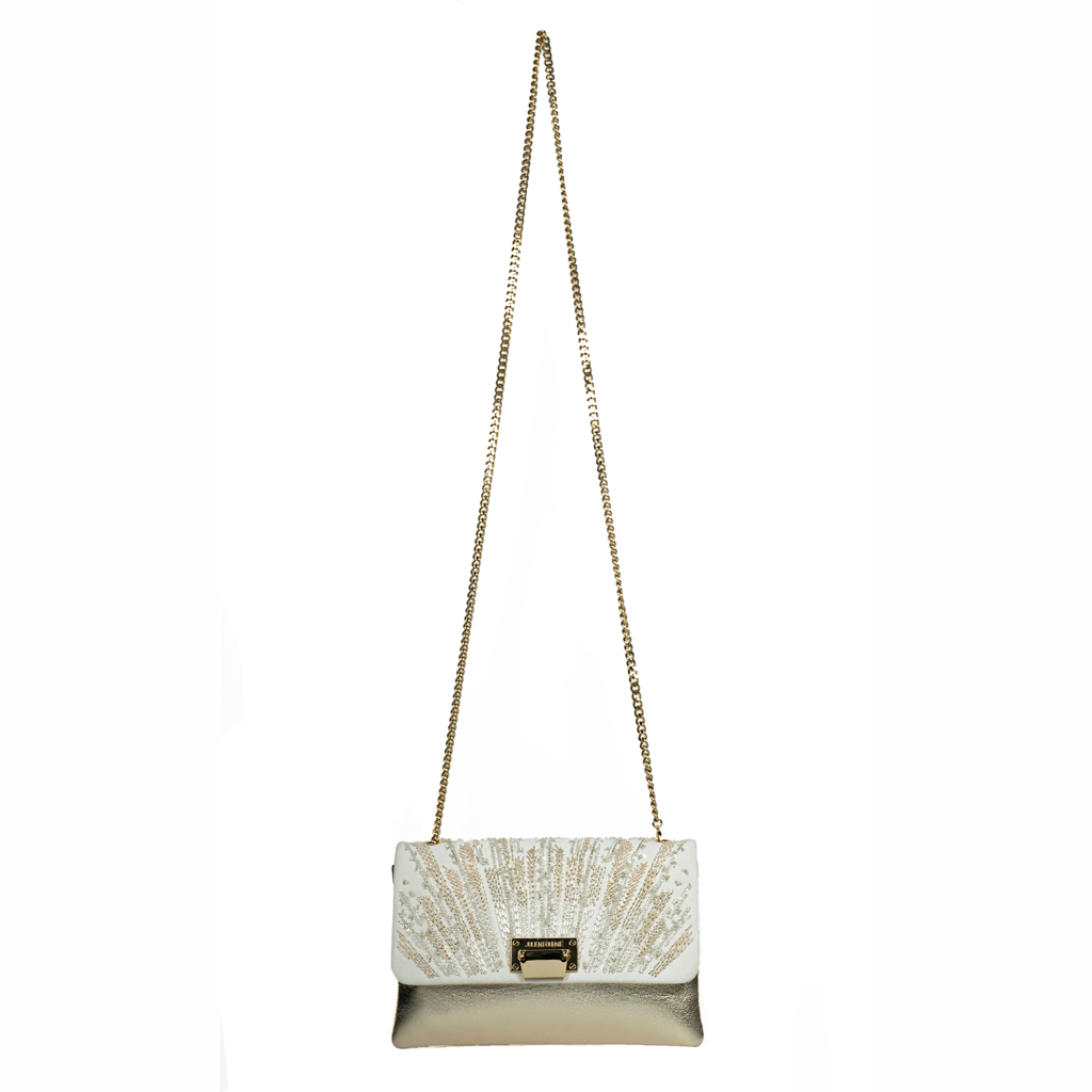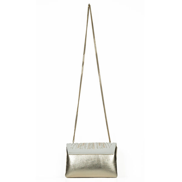 The side gussets are in White Gold leather. The removable and adjustable chain (length 121cm) and the metalwork are in “canon de fusil” color.