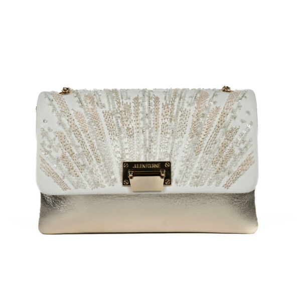 Embroidered Premier Sunshine bag, powder grain flap and White Gold dipped lamb leather.