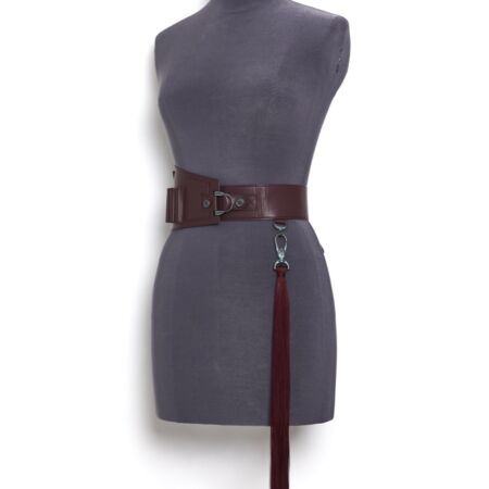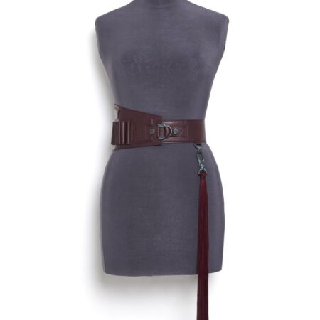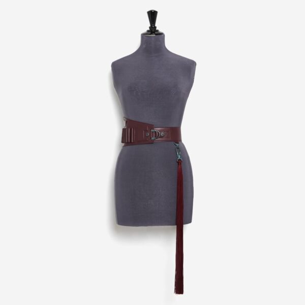 Haute Couture belt with removable cartridge belt in smooth Burgundy lambskin on a nude tone-on-tone overstitched collar, with a bright lacquered edge finish.