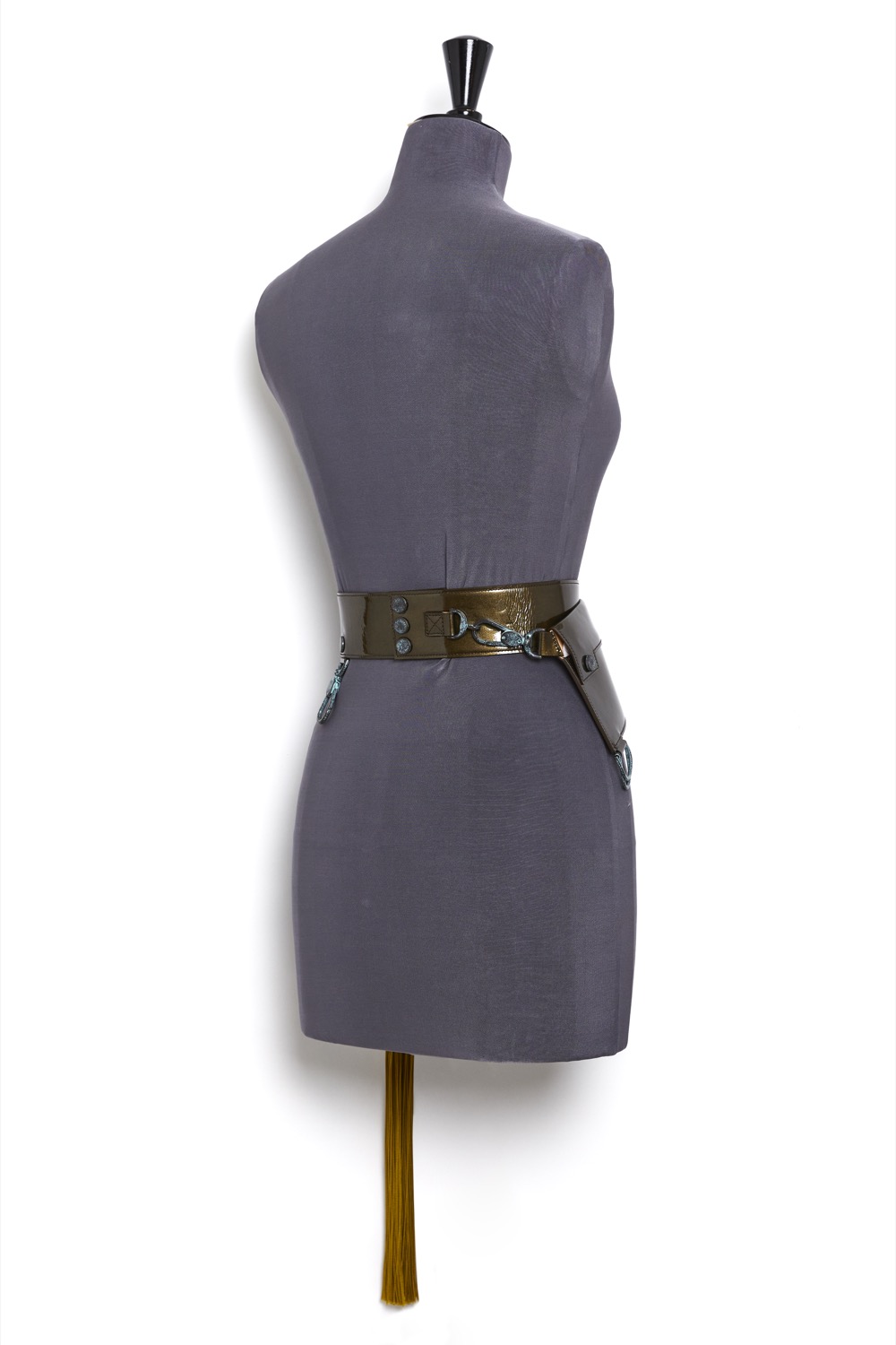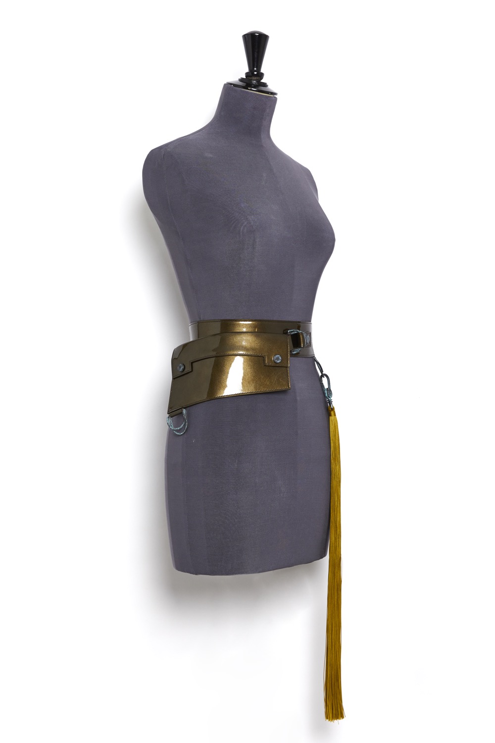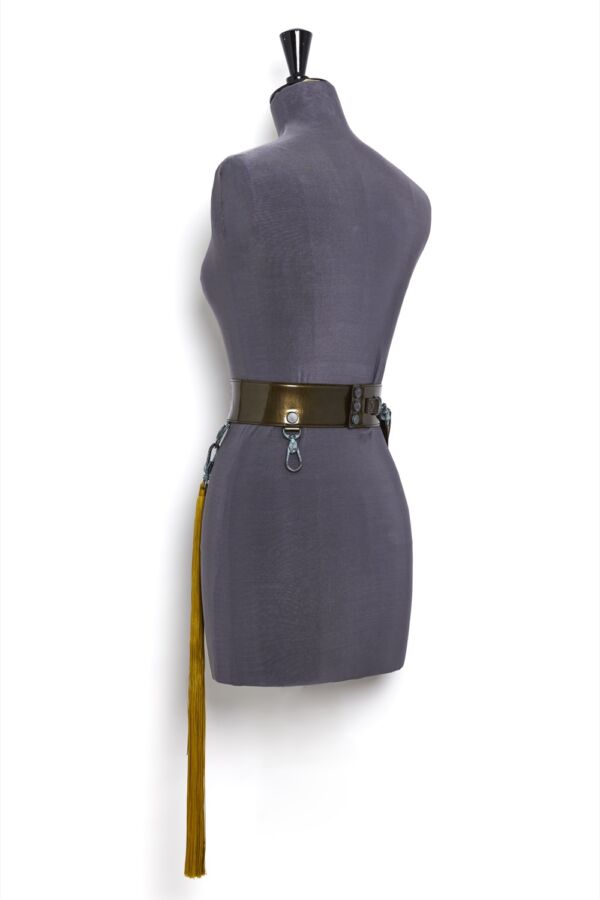 Haute Couture belt in metallic bronze patent leather with removable asymmetrical clutch bag, set on a nude tone-on-tone overstitched collar, with a bright lacquered edge finish.