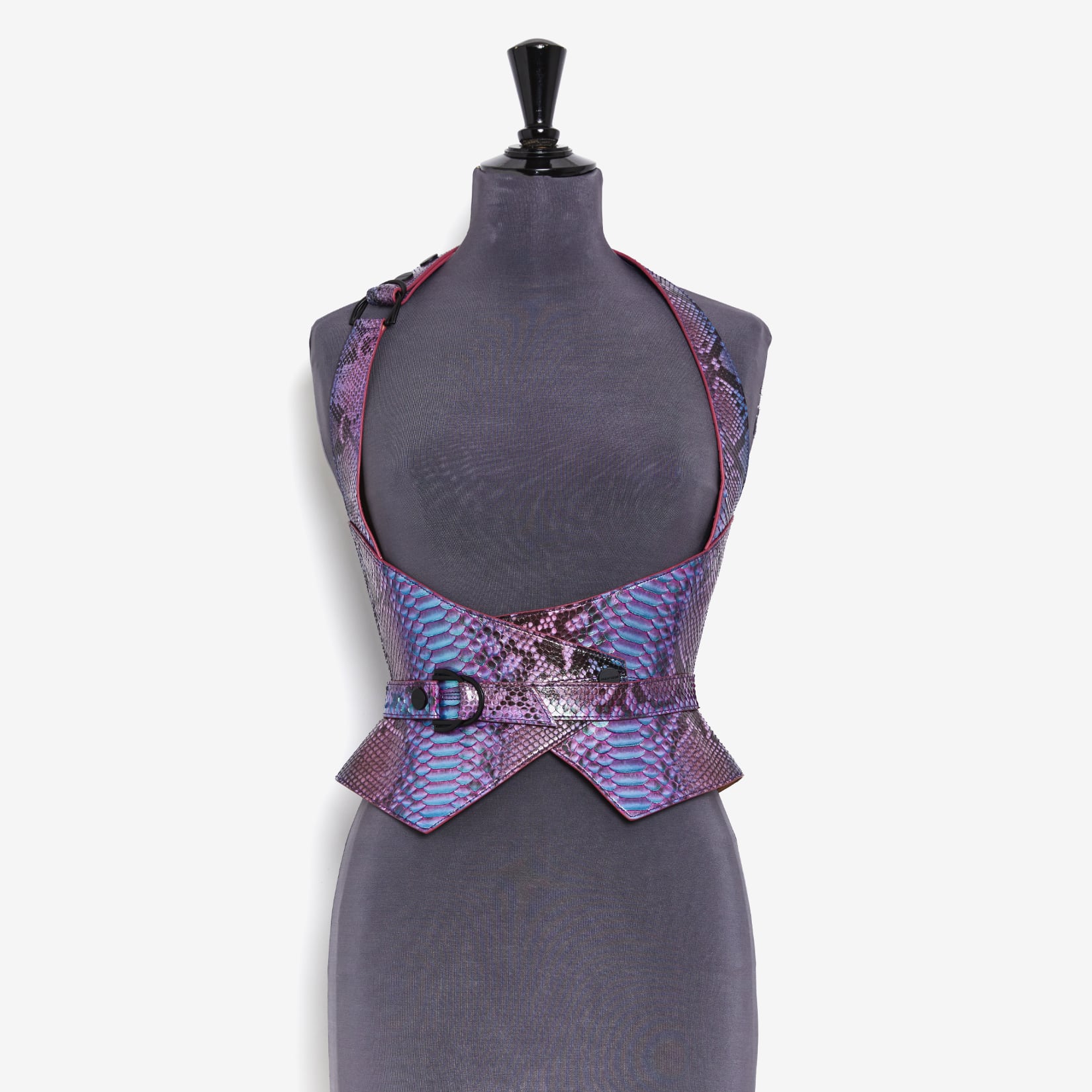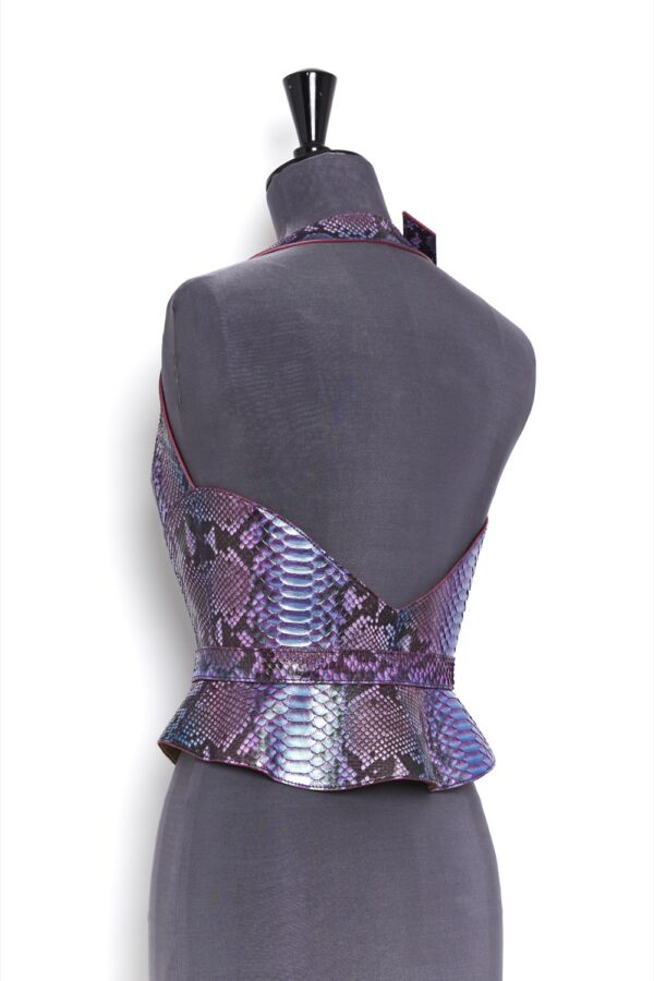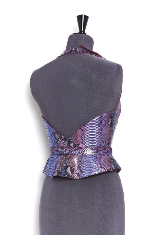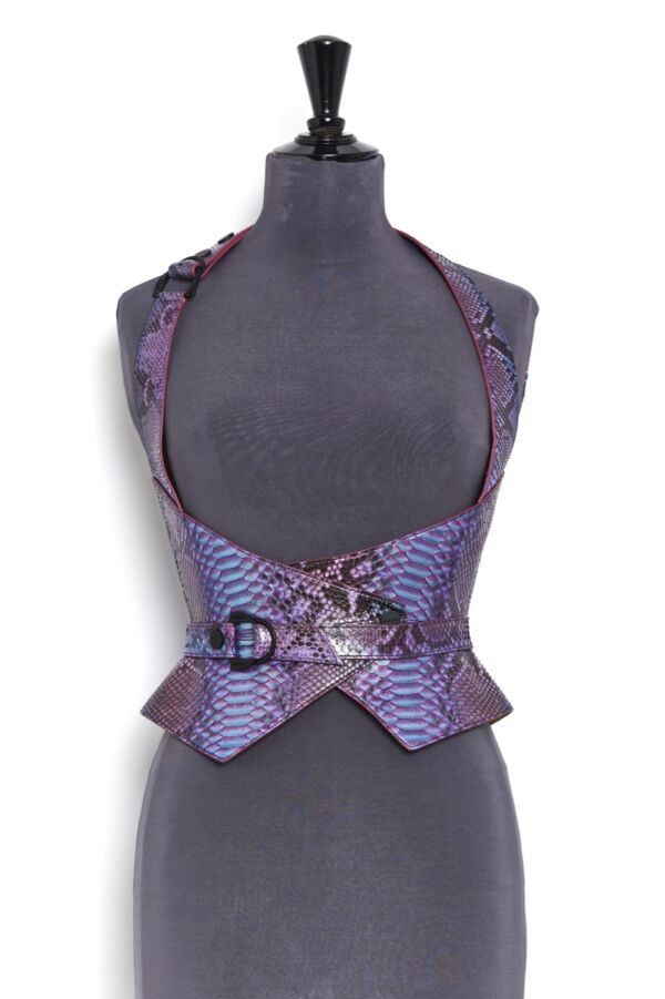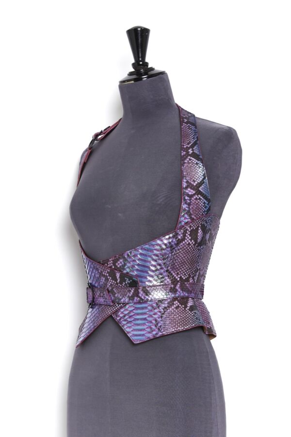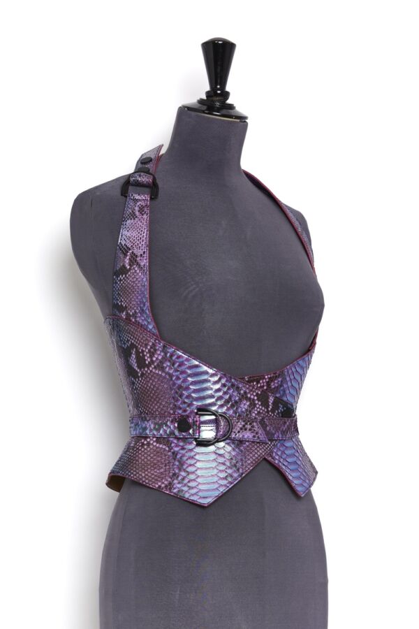 Haute Couture corset harness belt in genuine python on a nude tone-on-tone overstitched collar, with a bright lacquered edge, changing mermaid color.