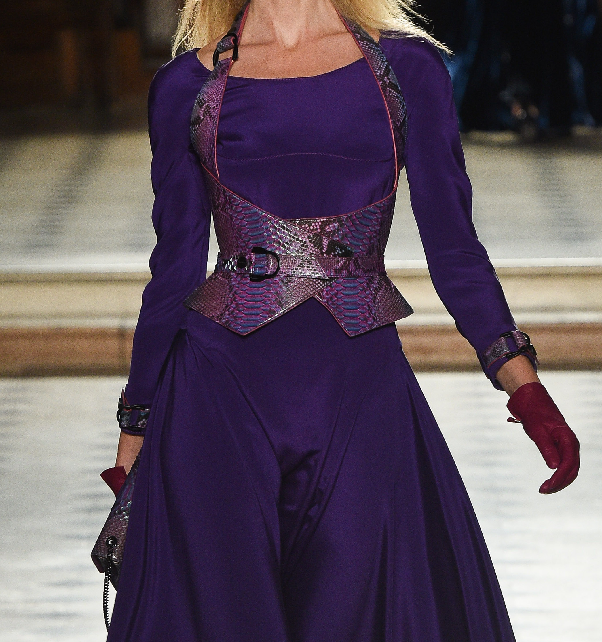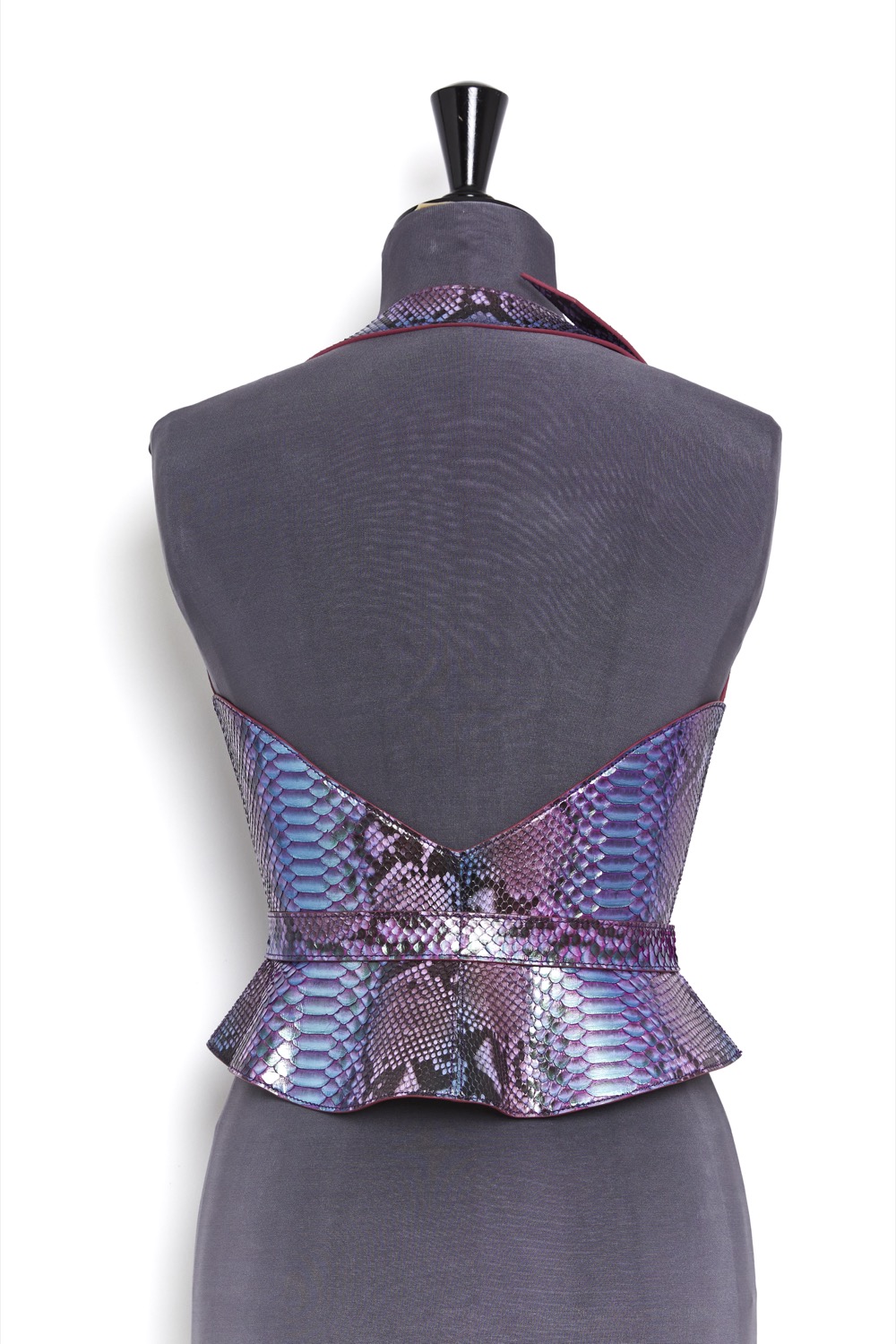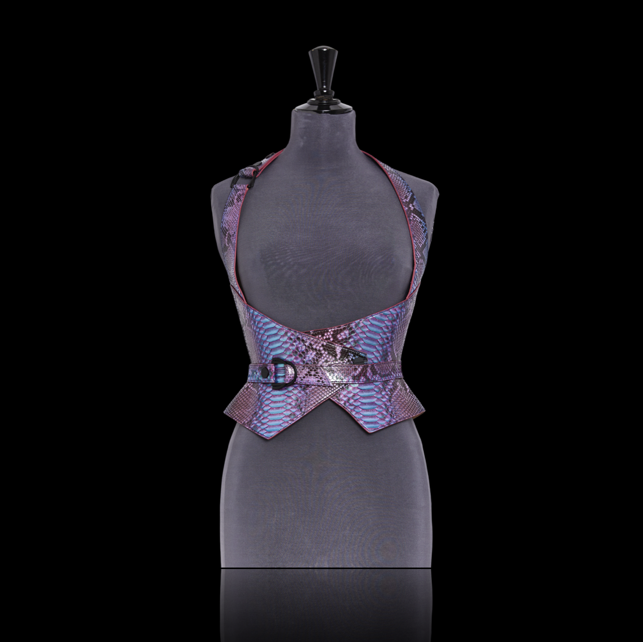 Haute Couture corset harness belt in genuine python on a nude tone-on-tone overstitched collar, with a bright lacquered edge, changing mermaid color.