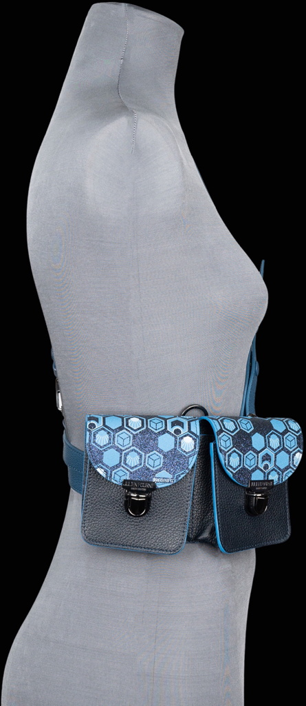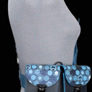 – Harness-style belt in smooth calf leather and Midnight Blue coated canvas, printed with the exclusive Hexagon monogram