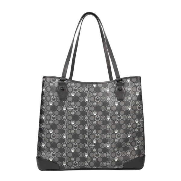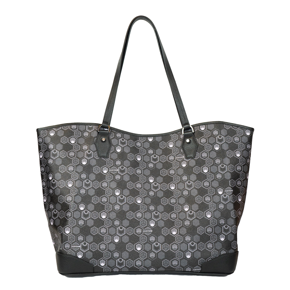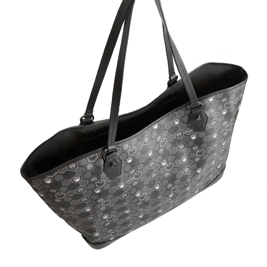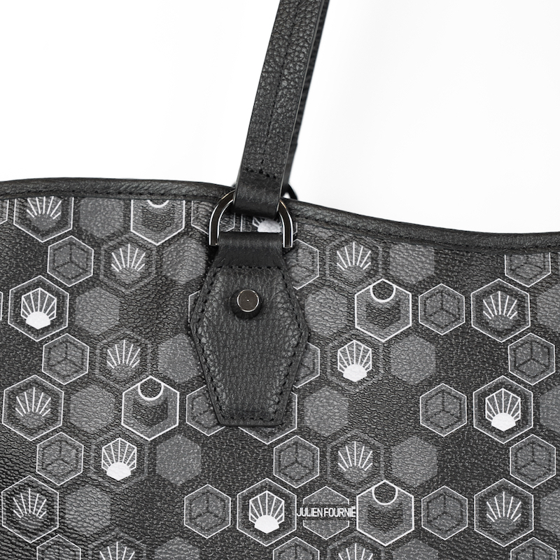 This black tote bag is made of mat-coated canvas with the exclusive Hexagon monogram designed by Julien Fournié and black grained calf leather.