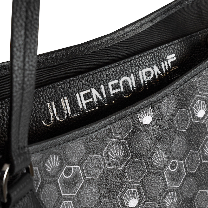 Giant Julien Fournié logo stamped in silver on the inside of the bag.