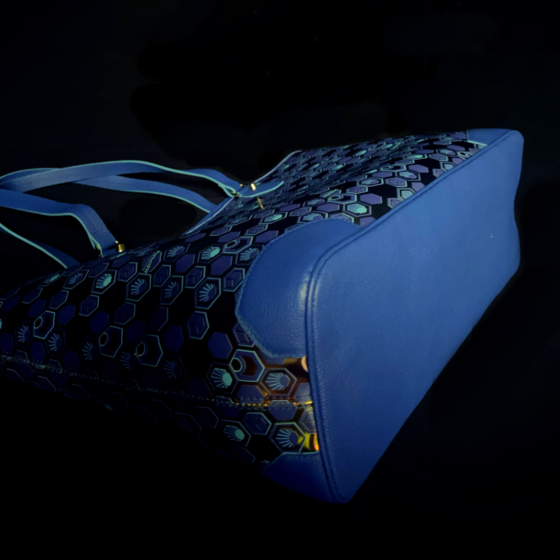 Immerse yourself in the singular allure of this exceptional tote, where deep-blue coated canvas with gold-flecked highlights meets azur-grained leather.