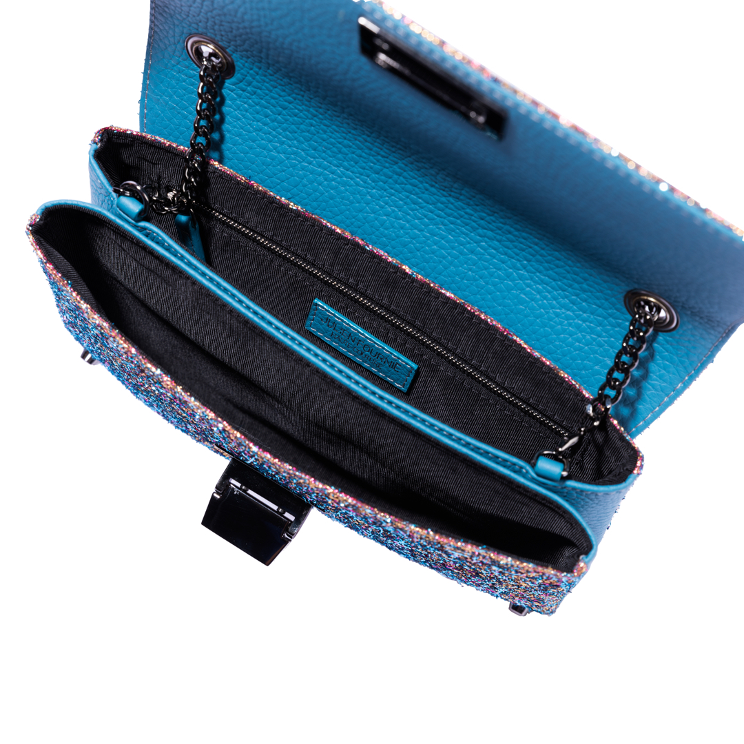 The removable and adjustable chain (Length 121cm) and the metalwork are “Gun barrel” color.
