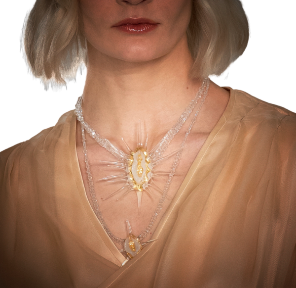 Double pendant jewel with sunburst and ” origine du monde ” motifs in blown glass and facetted crystal beads with gold leaf application imprisoned in the glass.