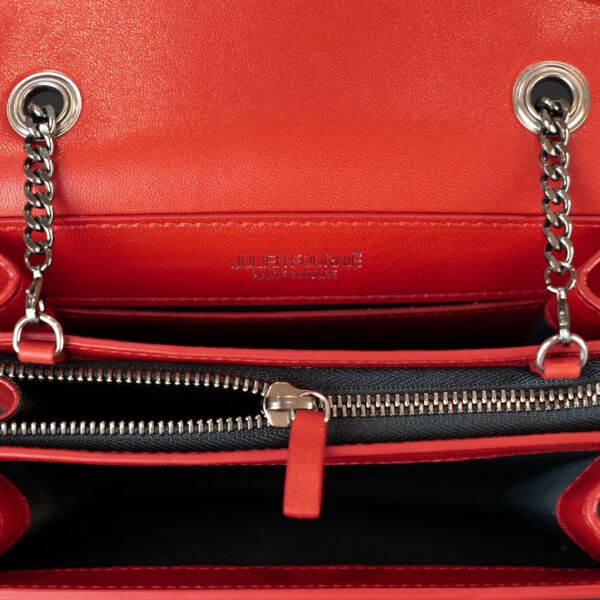 Equipped with a silver-toned chain and an innovative front strap, the bag can be worn gracefully over the shoulder or carried by hand, adapting effortlessly to any look. Its metal tuck clasp, finely engraved with Julien Fournié Haute Couture, marks its place within the exclusive realm of couture craftsmanship.