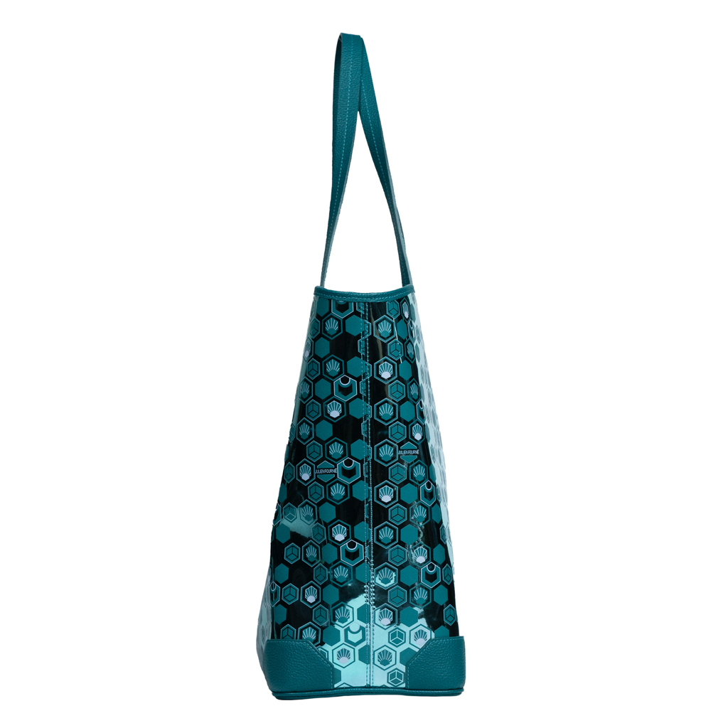 • Celadon mirror-effect coated canvas, subtly edged with micro-glitter to capture and reflect sunlight like a bright seaside.