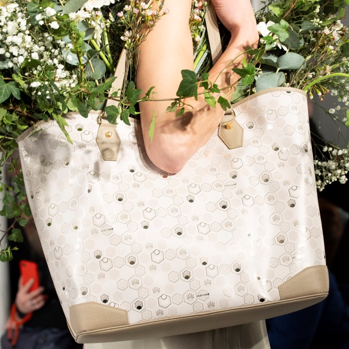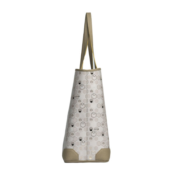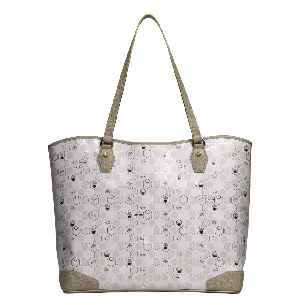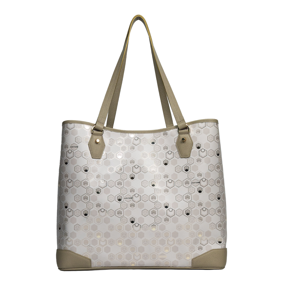 Saturne tote bag in Light Gold mirrored canvas with white silk print and hemp grained calf leather.