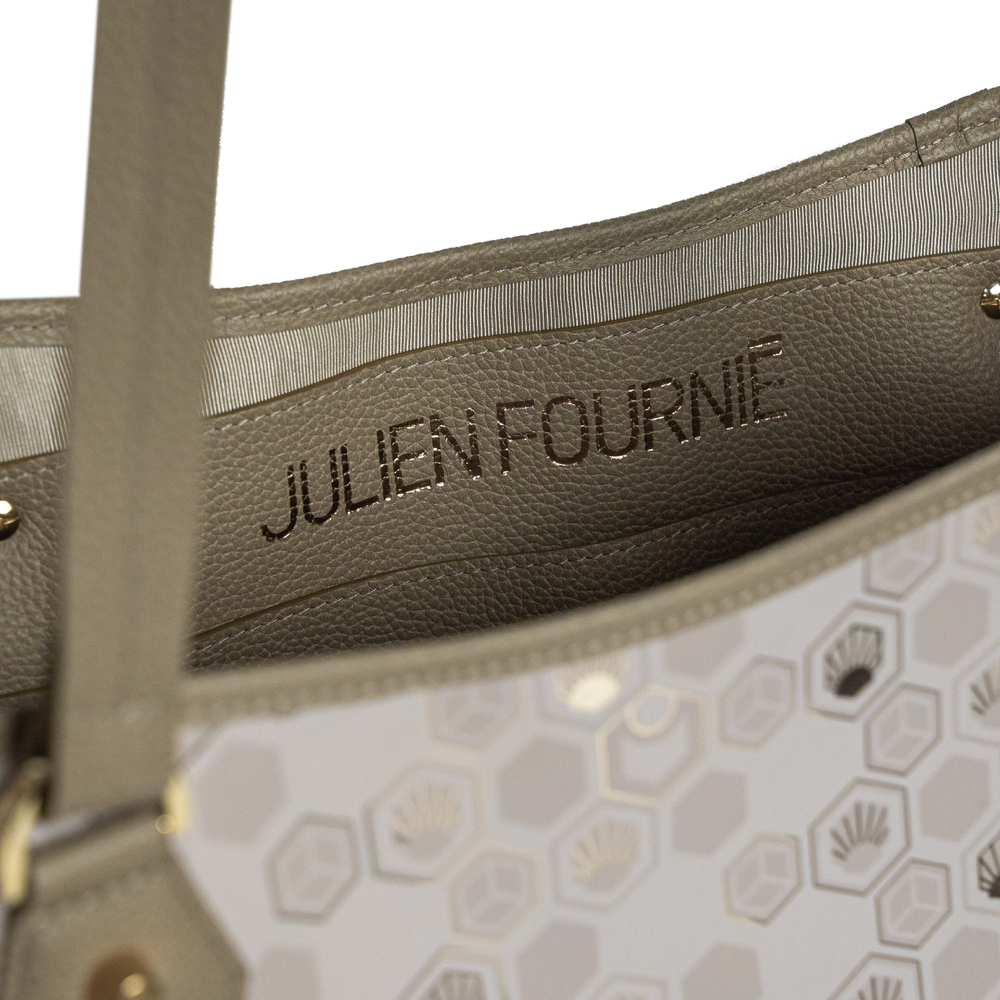 Giant Julien Fournié logo stamped in silver on the inside of the bag.