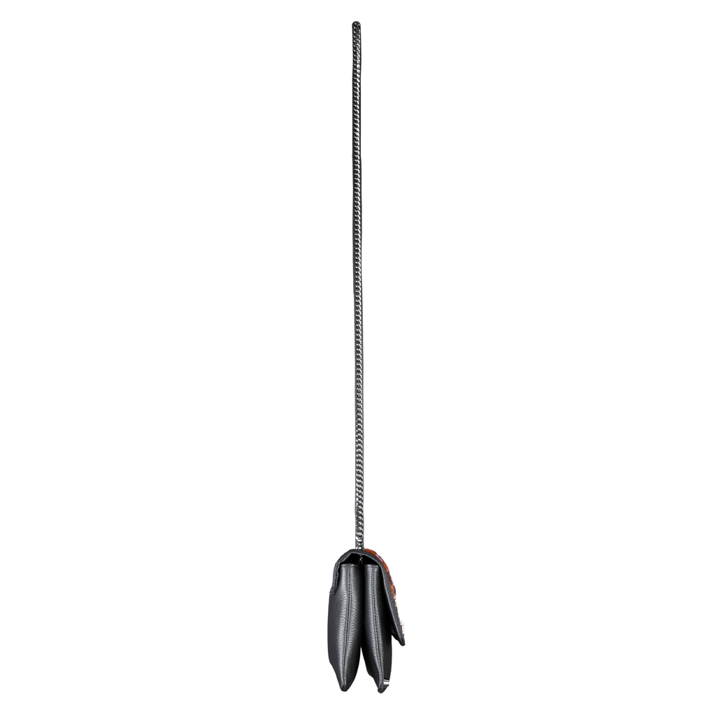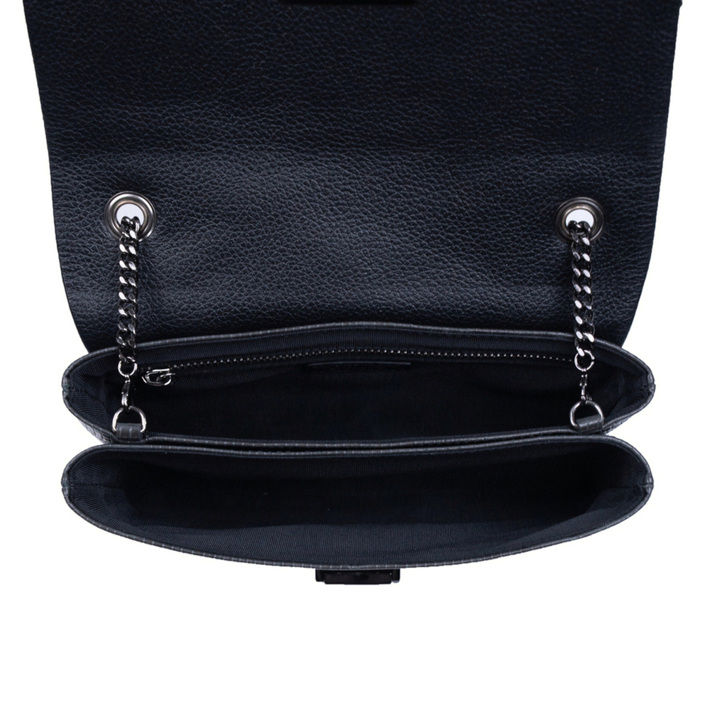 The 121 cm chain, adjustable and removable, is finished in gunmetal and, with a single motion, transforms the day bag into a chic evening clutch.