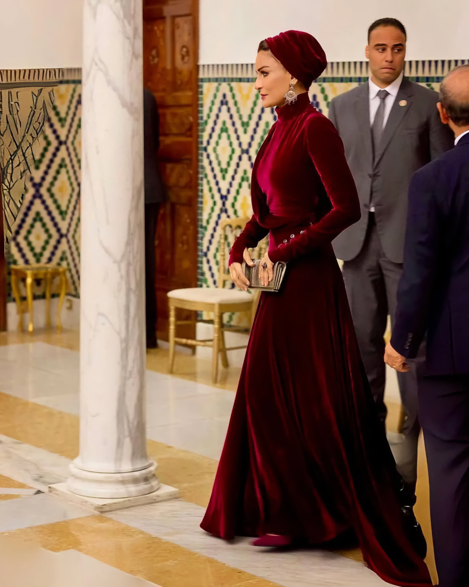 While visiting Tunisia in 2017, Her Royal Highness Sheikha Moza wore a majestic maroon couture gown by Julien Fournié, perfectly accessorized with gold jewelry, a matching clutch, and coordinating heels. This unforgettable look exemplifies the timeless elegance that is truly in Sheikha Moza’s DNA.