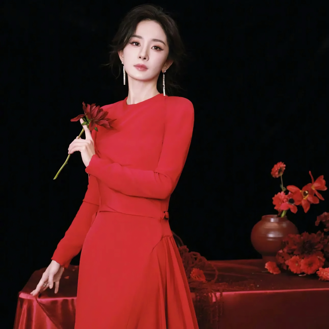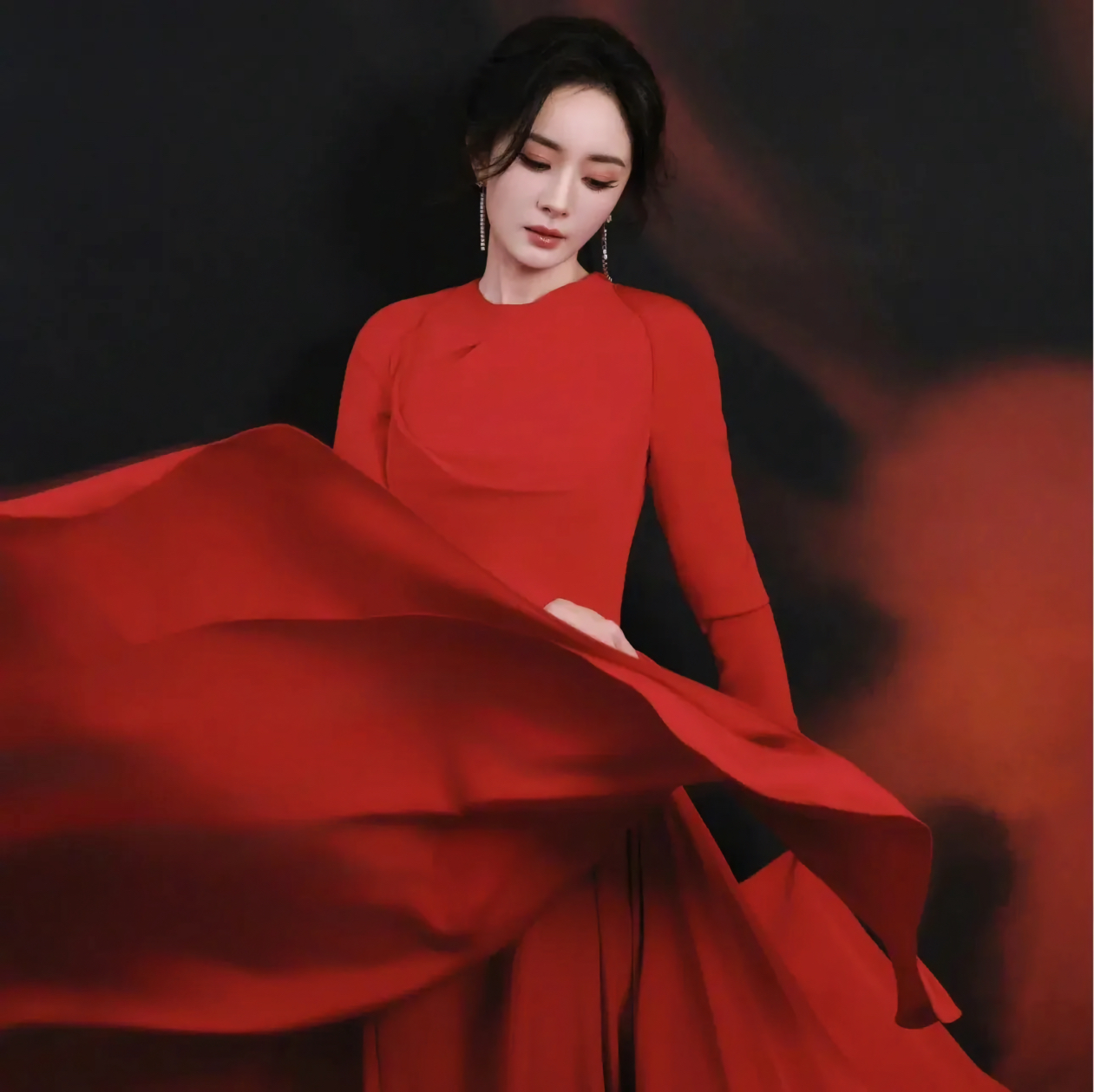 Yang Mi (杨幂) wore an asymmetrically draped, raglan‑sleeved dance gown from the Haute Couture First Crime collection, fashioned in sumptuous ruby silk. Its fluid silhouette and sculptural draping caught and amplified Yang Mi movements, giving the look a striking blend of contemporary edge and timeless refinement.