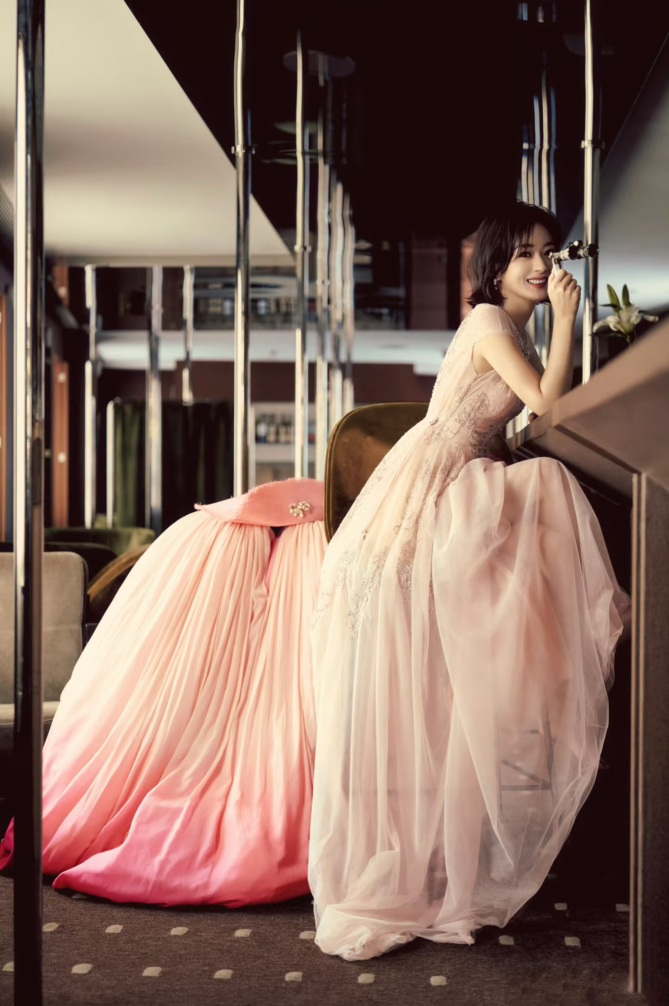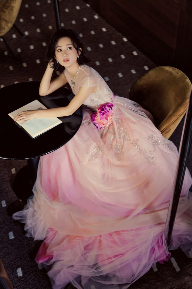 The dress worn by Zhao LiYing is adorned at the waist with peonies in silk organiza and gradient pink feathers.