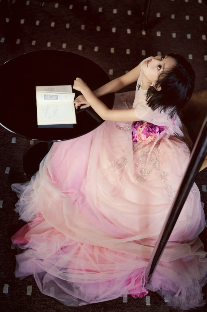 The petticoat, like a peony, is composed of a multitude of layers of gradient pink tulle (800 meters of tulle) covered with a final layer of fuchsia gradient petal pink chiffon.
