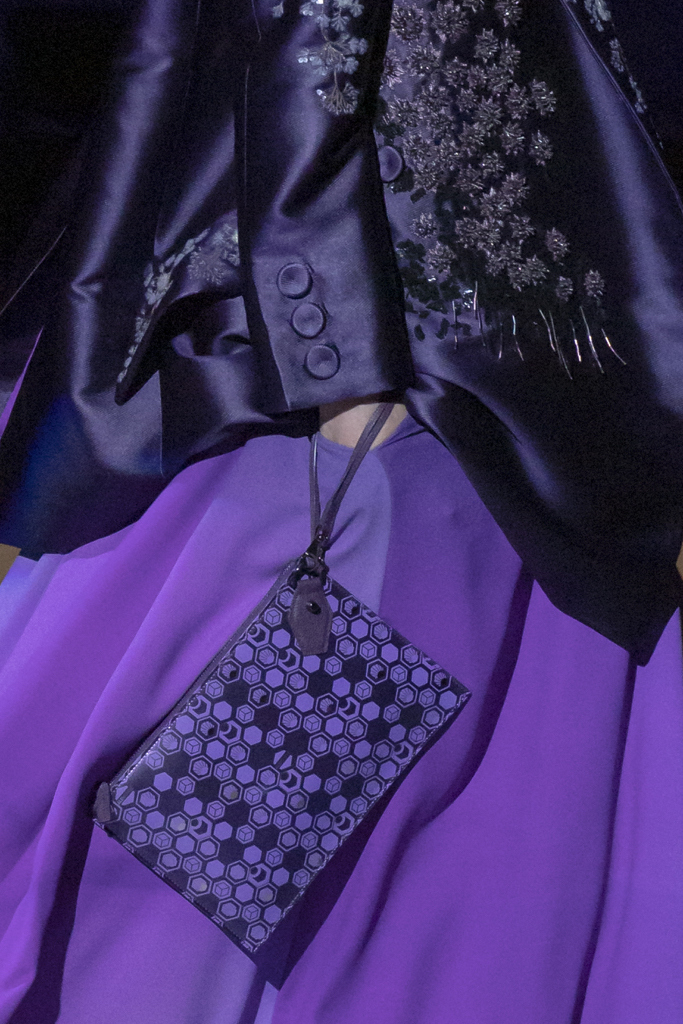 ROBE LOOSE À DÉCOLLETÉ MYSTÈRE EN CRÊPE DE SOIE NUIT DÉGRADÉ NÉON VIOLET, PORTÉE AVEC UNE VESTE SIGNATURE OVERSIZE CROISÉE EN JACQUARD DE SOIE LAQUÉE PRUNE ET BRODÉE DE MOTIFS HERBIER VINTAGE EN CRISTAL 3D.