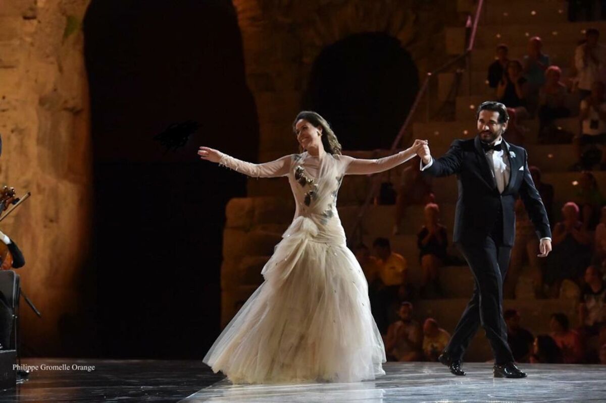 Erminie Blondel était en Julien Fournié Haute Couture devant les quelques 8000 spectateurs du Théâtre antique d’Orange, lors de Musiques en fête en ouverture des Chorégies d’Orange 2022. Ce programme, présenté par Judith Chaine et Cyril Féraud, était diffusé sur France 3 et en simultané sur France Musique.