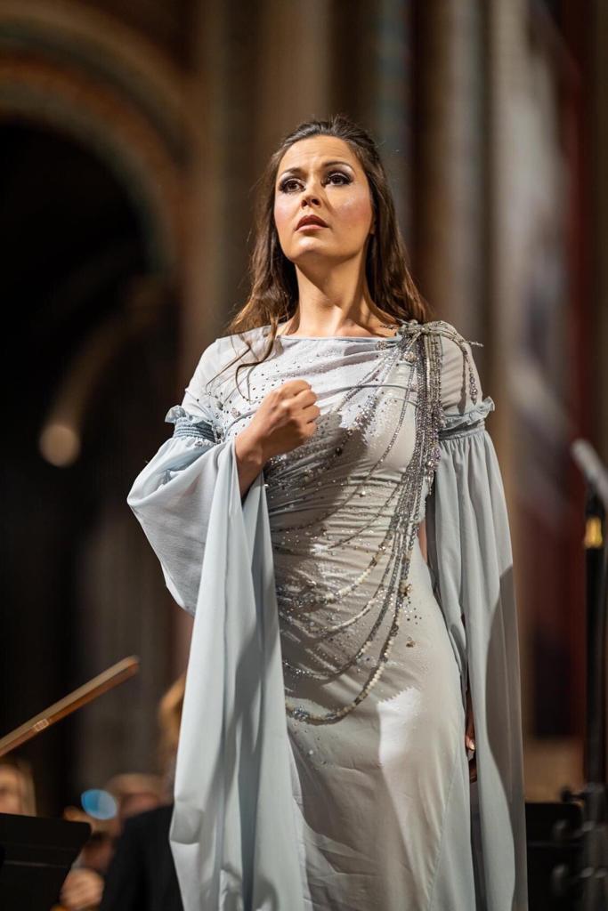 La soprano Erminie Blondel était en Julien Fournié Haute Couture pour un concert à l’Église de la Madeleine à Paris où elle a notamment chanté l’ Air de Micaëla « Je dis que rien ne m’épouvante » de Carmen de Georges Bizet, l’Ave Maria d’Otello de Giuseppe Verdi, et Casta Diva de Norma de Vincenzo Bellini.