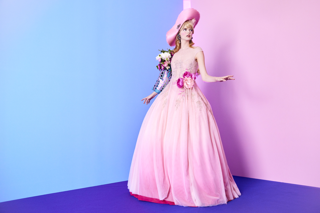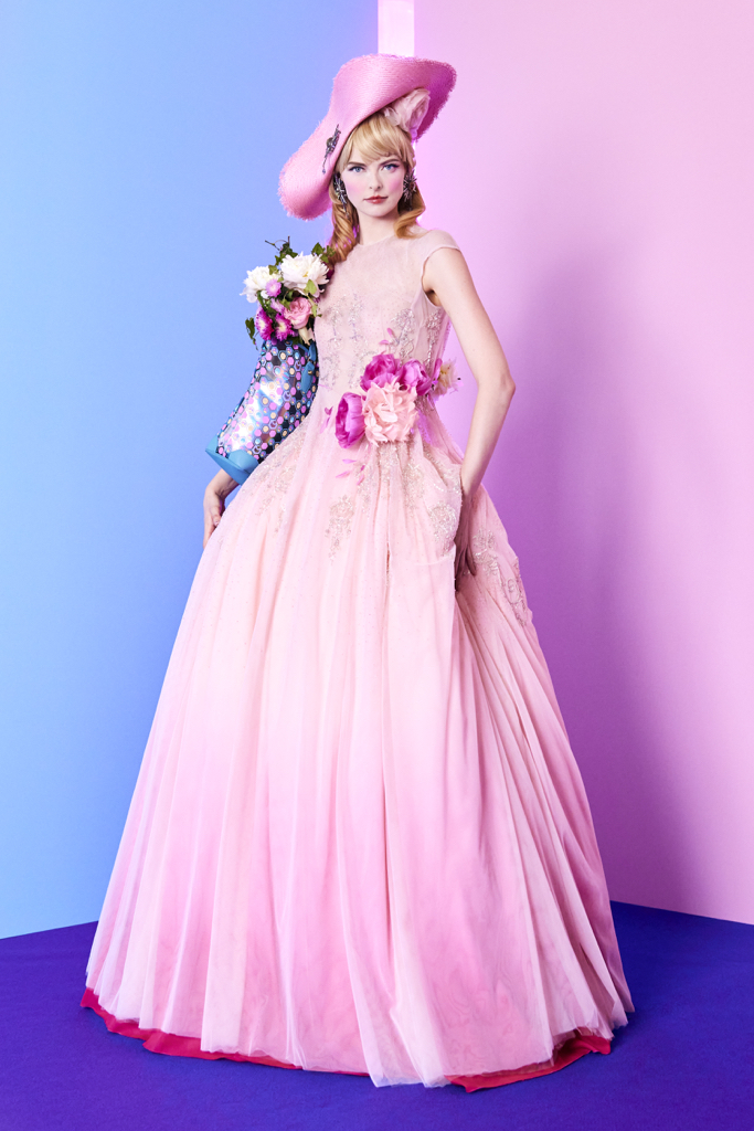 Le jupon, tel une pivoine, est composé d’une multitude de couches de tulle rose dégradé (800 mètres de tulles) recouvert d’une dernière couche de mousseline de soie rose pétale dégradé fuchsia. Le tout est froncé à la taille, pour obtenir un vertugadin, comme au XVIIIe siècle.