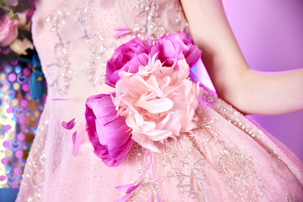 Cette robe est ornée à la taille par des pivoines en organisa de soie et plumes rose dégradé.