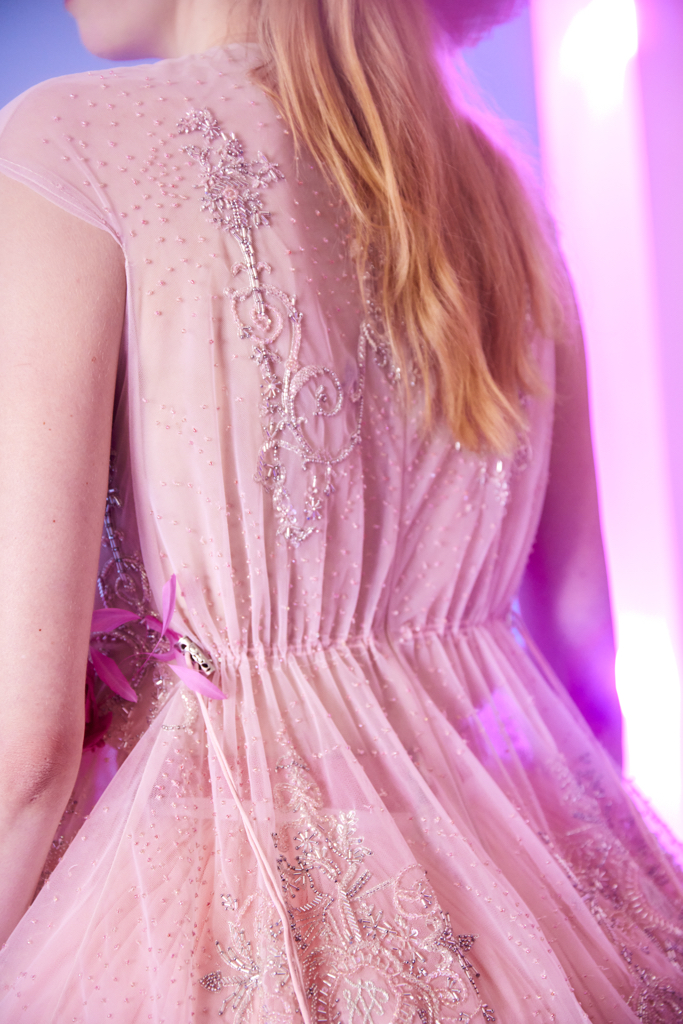 La robe à manches courtes est en tulle rose tendre. Elle est froncée dans le dos, à l’aide de stop-cordons qui lui apporte une allure actuelle. La robe est brodée d’une multitude de motifs chandelier, une signature de la Maison Julien Fournié Haute Couture, de perles de cristal transparentes, de fils d’argent et de cristaux scintillants couleur aurore boréale.