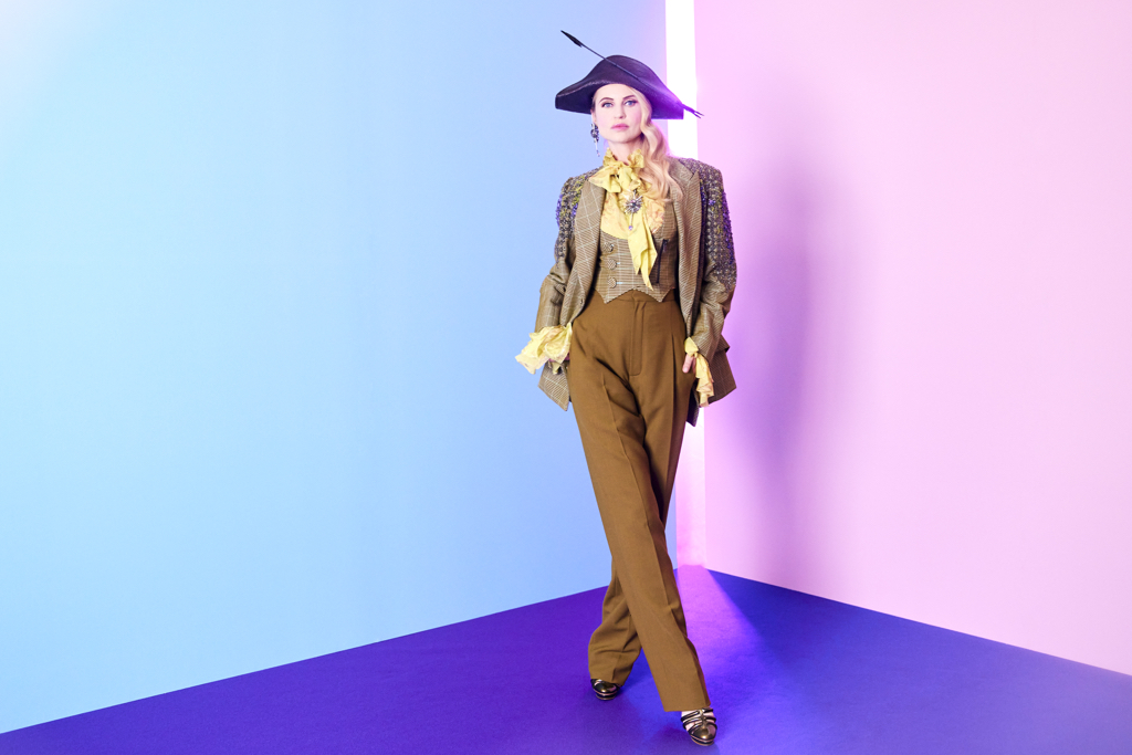 L’ensemble est porté sur une blouse lavallière à volants et à manches à effet ruché qui est en mousseline de soie imprimée de motifs floraux XVIIIe et à motifs jacquard or grand siècle.